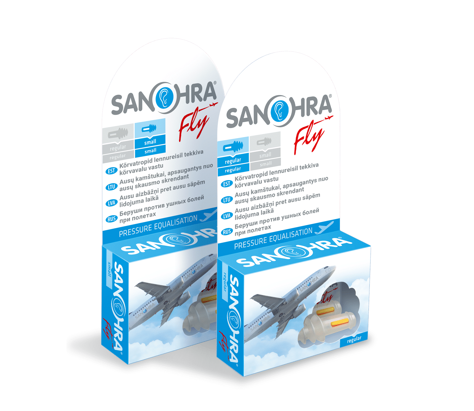 Skrydis lėktuvu kartais suteikia ne vien malonius pojūčius. Slėgio skirtumas ir ausų skausmas gali varginti tiek suaugusiuosius, tiek mažuosius keliautojus. Retais atvejais, net kelias dienas. “SANOHRA fly” ausų kištukai gali tapti tikru išsigelbėjimu nuo šalutinių neigiamų padarinių skrendant lėktuvu. Ausų kištukai suformuoja nedidelę kamerą ausies landoje prieš ausies būgnelį, o specialus filtras sulėtina oro slėgio padidėjimą joje. Toks buferio efektas kameroje apsaugo ausies būgnelį nuo skausmo. Ausų kištukus naudoti rekomenduojama prieš kilimą ir prieš nusileidimą. Lėktuvui pakilus, juos išimti patartina praėjus 30 minučių, o jei skrydis trumpas, geriausia naudoti viso skrydžio metu. Svarbu paminėti, kad “SANOHRA fly” ausų kištukų poveikis yra įrodytas moksliniais tyrimais. Tinka ir mažiems vaikams iki 3 metų, bet juos įdėti ir išimti turi tik suaugusieji. Ieškokite „Keliaujančios mamos” eparduotuvėje lengvesnėms kelionėms čia.