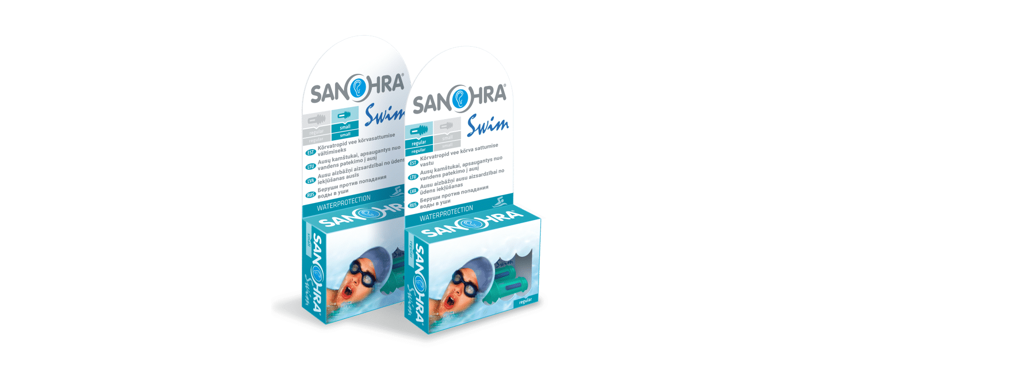 Vandens pramogų mėgėjų padaugėja vasarą, kai iš baseinų keliaujame prie jūros, ežerų, upių. Tačiau ilgiau nei įprastai būnant vandenyje, ausies landa paburksta ir susidaro terpė daugintis patogenams. “SANOHRA swim” ausų kištukai apsaugo ausis nuo vandens patekimo. Ausies kištukas keturiomis minkštomis, elastingomis plokštelėmis, turinčiomis ypatingą formą, „įsitvirtina“ ausies landoje, todėl „SANOHRA swim“ patikimai apsaugo ausį. Be to, kištukai patogiai gali būti ausyje ir ilgesnį laiką. Todėl vanduo negali patekti į ausies landą. Tinkami ir mažiems vaikams iki 3 metų.