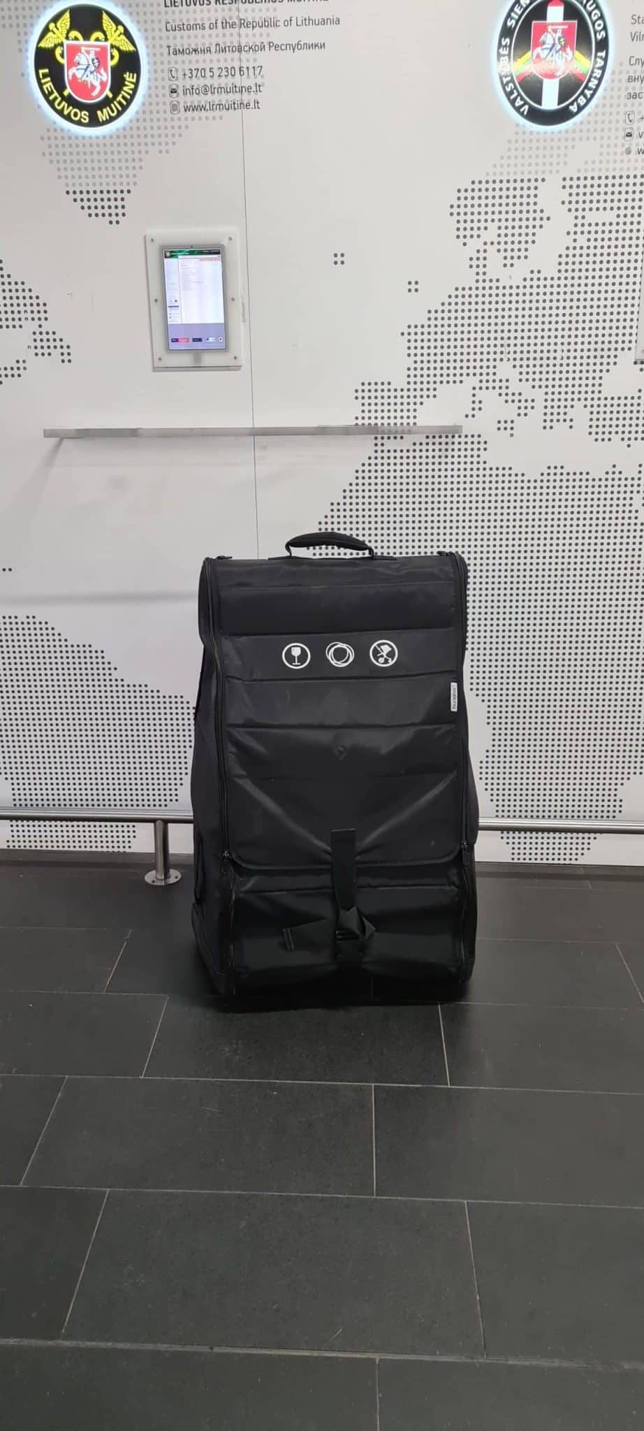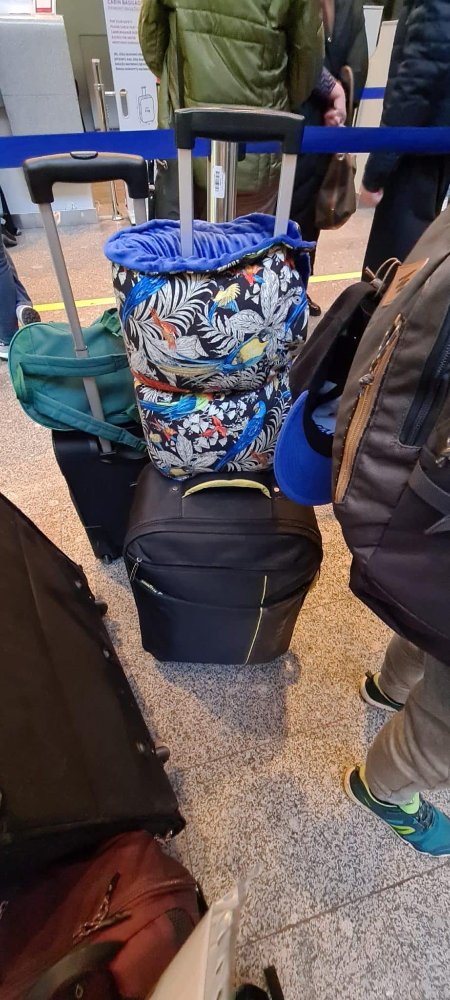 Norėdami visiškai nesijaudinti dėl vežimėlio sugadinimo oro uostuose, vežimėlį įdėjome į transportavimo krepšį. Na, tiesą pasakius, į krepšį įdėjome ne tik vežimėlį, bet ir pakuotę sauskelnių, kuprinę nešynę (kuri pravertė tose vietose, kur su vežimėliu praeiti buvo sudėtinga, pavyzdžiui Ubude). Tiek vežimėlio transportavimo krepšį, tiek ir kuprinę – nešynę išsinuomoti galima iš Šeimostogų.