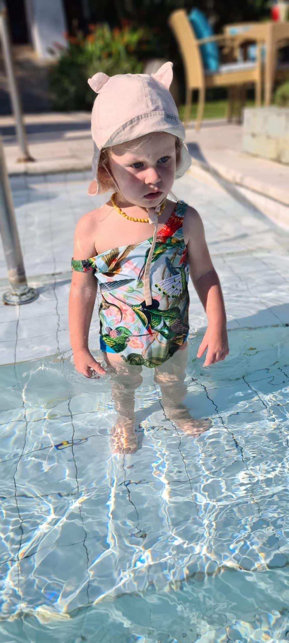 Nieko nenustebinsiu, tik dar kartą patvirtinsiu, kad apsauga nuo saulės yra MUST dalykas! Vaikams vežiausi su aukšta, net 50 SPF apsauga, sau ir vyrui 30 SPF (nors pati dažniausiai tepiausi stipriąją apsaugą). Kalbant apie veido odą, kuriai saulės spinduliai gali pridaryti daug žalos, pasidalinsiu tikru atradimu – tai mineralinė biri pudra (Jane Iredale), kurios sudėtyje JAU yra ir SPF apsauga. Be galo patiko, kad į kelionę neteko vežtis šepetėlio ir pudros atskirai – čia viskas jau integruota! Neužima daug vietos, lengvai ir greitai pasidengia. Man asmeniškai labai patiko, kad pudra maskuoja, bet veidas atrodo labai natūraliai. Tikrai rekomenduoju visoms keliaujančioms, norinčioms užmaskuoti, bet atrodyti itin subtiliai ir natūraliai mamoms!
