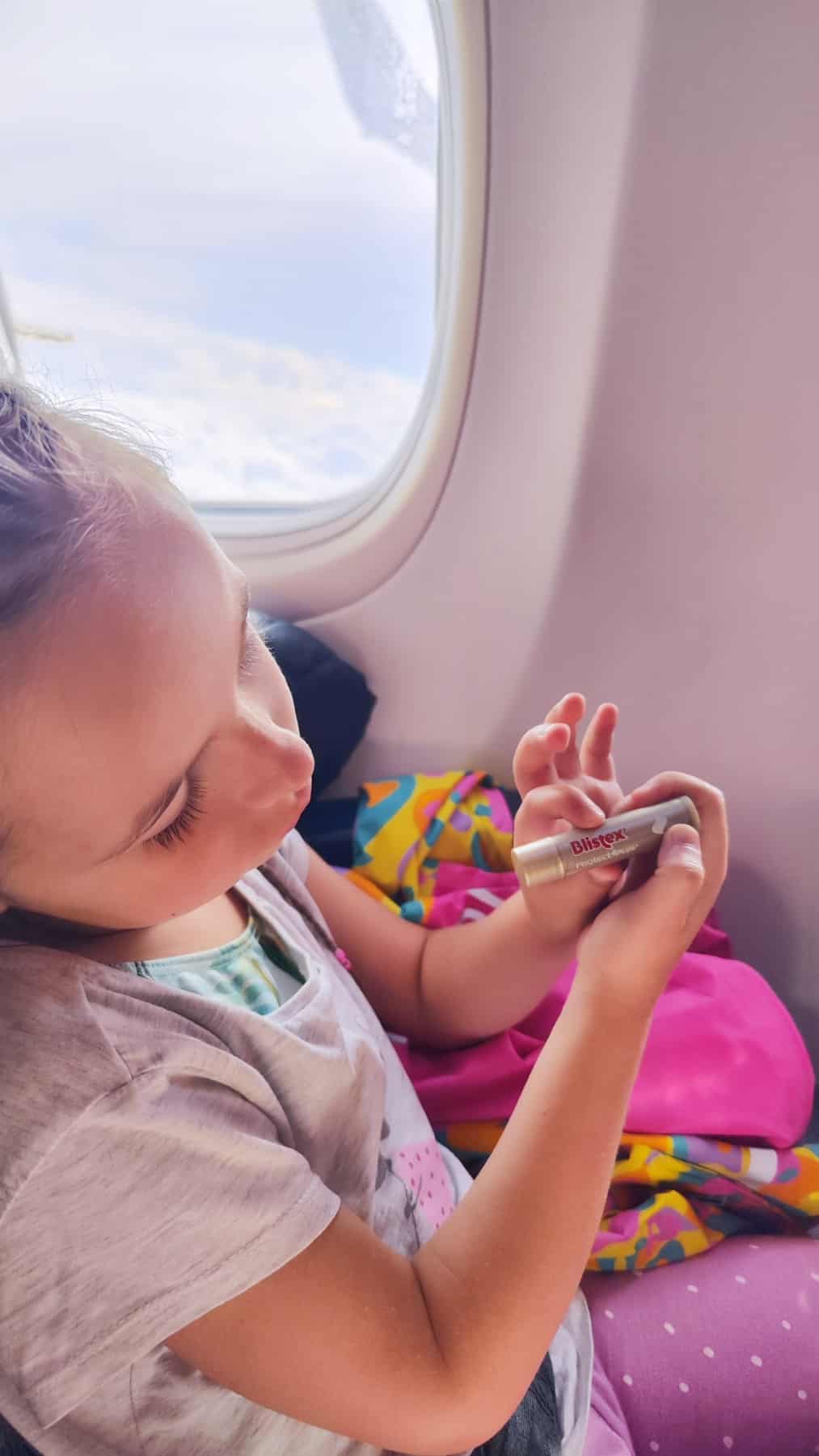 - Nepamirštame tikros damos atributų – lūpdažių! O jei rimtai, tai tiek lėktuve dėl sauso oro, tiek atostogų metu drėkinti ir apsaugoti vaikų (ir mamų) lūpas, manome, kad būtina! Tai šįkart vežėmės jau minėtą balzamą lūpoms su SPF ir dar vieną vaikišką balzamą vienaragio formos (na kaip gi kitaip!🦄 radom netyčia, tai kai pamatė, teko pirkti…)