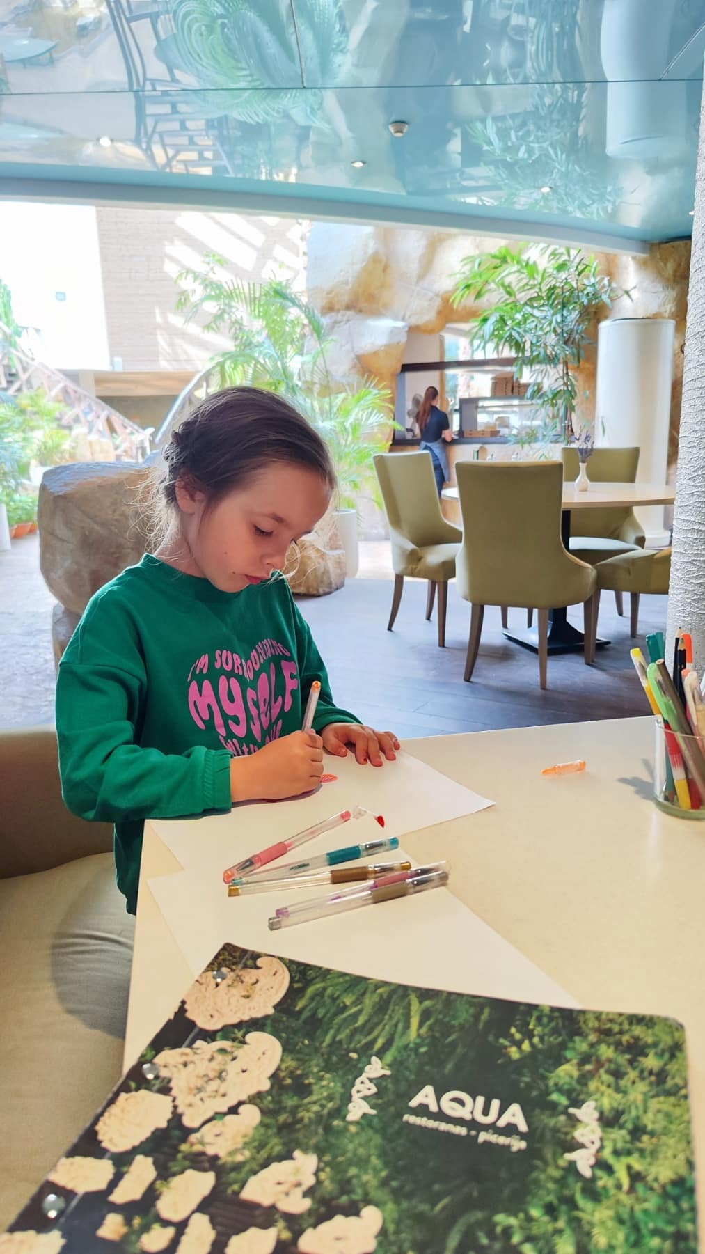 Išalkusiems: antrame vandens parko aukšte – picerija. Į piceriją mes šįkart neužsukome, bet pavalgyti pasilikome jau išėję iš vandens parko erdvės, tame pačiame AQUA viešbučio restorane. Labai maloniai nustebino patiekalų pateikimas, porcijos, skonis. Ir aptarnavimas. Rašom pliusą.