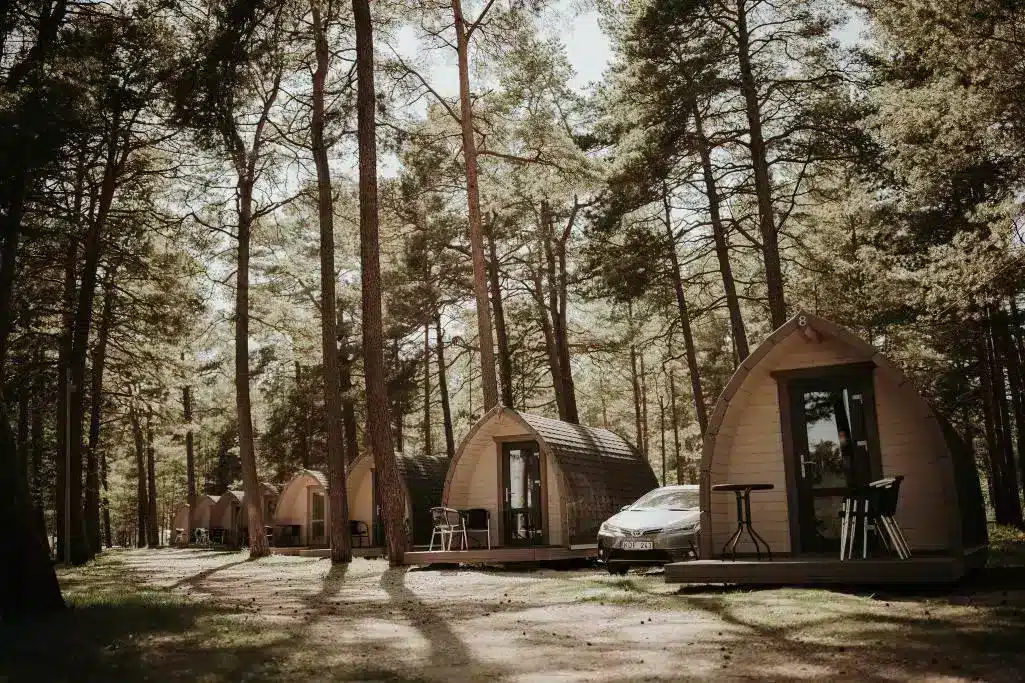 Nakvynės galimybės: galima išsinuomoti medinius namelius, įsikurti vietose palapinėms ir kemperių aikštelėse.