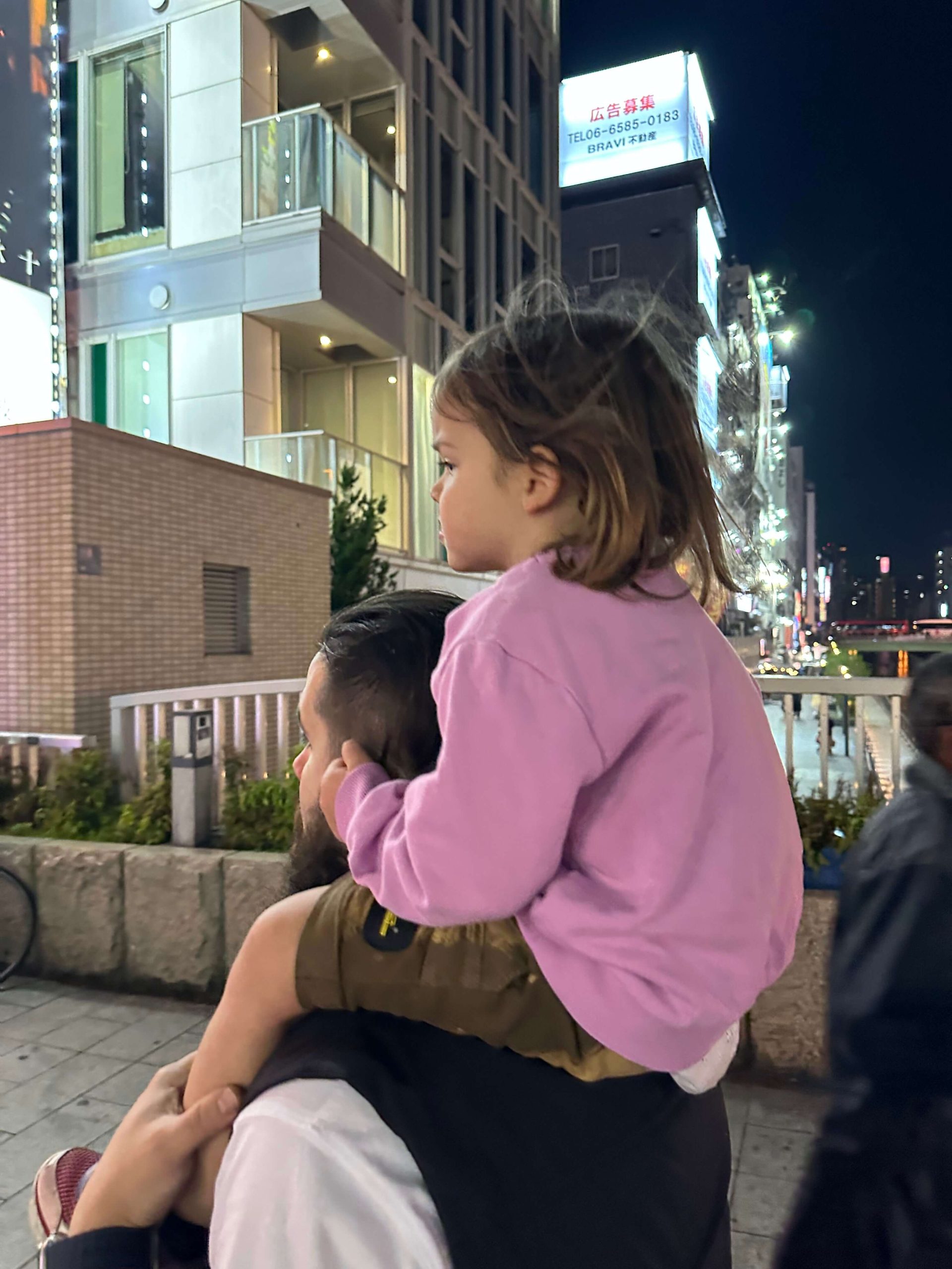Grįžę iš Naros miesto, vakarą praleidome Osakos Bay rajone, kuriame yra daug veiksmo, daug maisto, daug šurmulio, bet mums labai patiko. Netikėtai surizikavome ir gerokai nuklydę nuėjome į labai nedidelį restoranėlį, kuris netikėtai nustebino ir tapo viena iš geriausių vietų, kurioje vakarieniavome. Mūsų nuostabai pagyvenęs šefas ne tik puikiai kalbėjo angliškai, bet ir turėjo ir platų Wagyu jautienos pasirinkimą. Dar iki šiandien paklausus vaikų, kas labiausiai patiko Japonijoje, jie iš karto pažiūrėję vienas į kitą vieningai atsako – mėsytė.