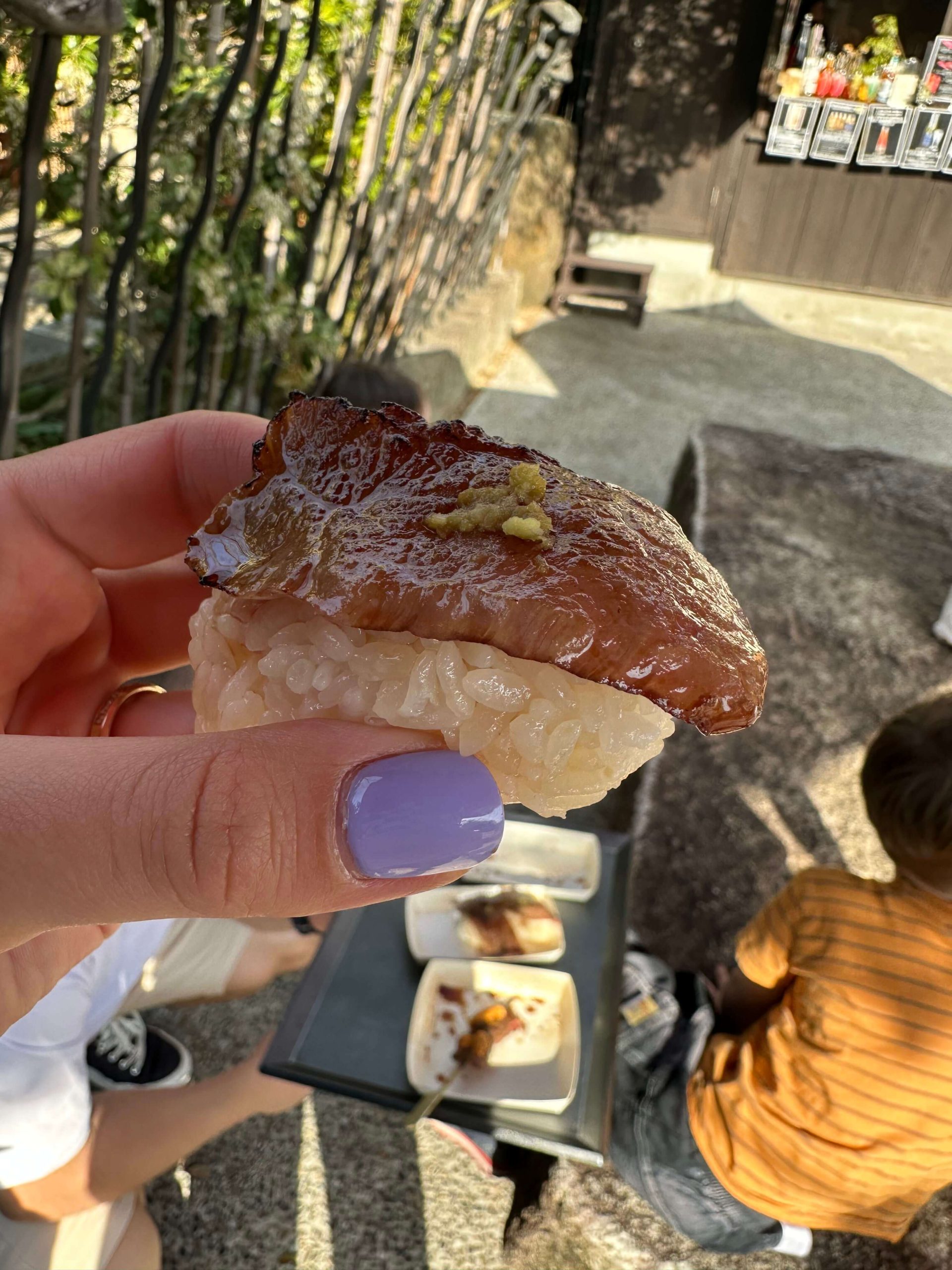 Beje, kalbant apie Wagyu jautieną, pietums pasiemėme tiesiog ant gatvės pardavinėjamus Wagyu iešmelius ir Wagyu „sušiu“ (tiesiog Wagyu jautiena ant suspausto ryžio burbuliuko). Nenuvylė nei kiek, net sakyčiau mūsų gerai išsilaksčiusiai šeimynai, tai buvo tiesiog wow!