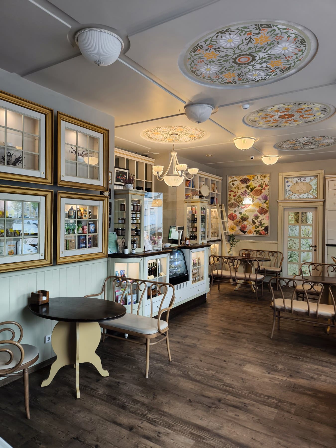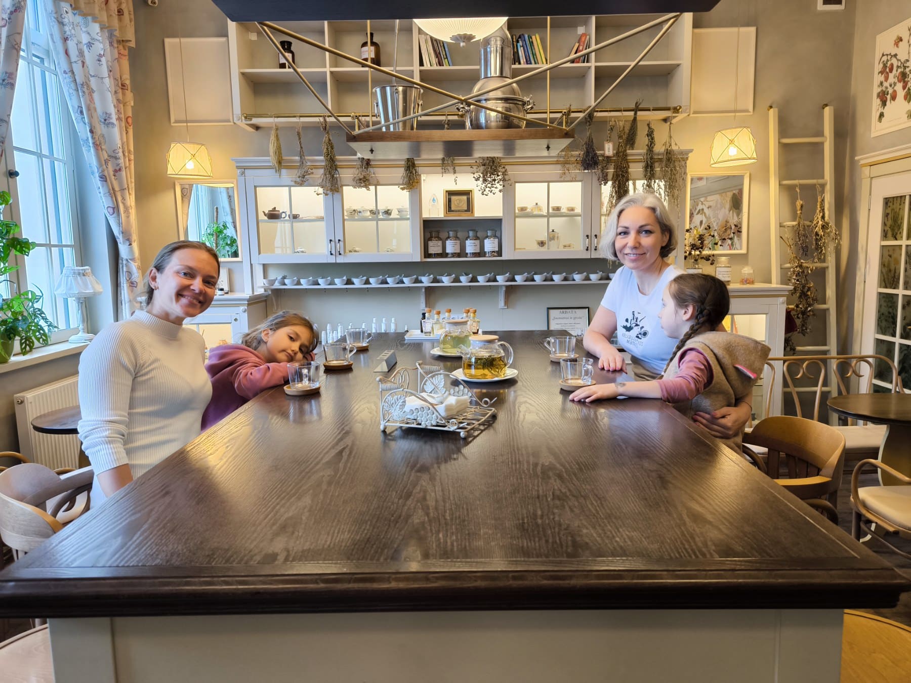 Į šią vietą labai norėjome patekti. Jau vien tai, kad „Valerijonas” yra viena seniausių tebeveikiančių vaistinių, turinti ir savo muziejų. Jame galima pamatyti autentiškus vaistus, vaistininko užrašus ir net šimtmečio sulaukusį kremą – labai įdomu. O dar su galimybe išgirsti pasakojimą apie šiuo metu „Valerijono” kosmetikos gamyboje naudojamas natūralias medžiagas, kurias net galima valgyti (taip taip – išragavome ir įvairių aliejų) bei pačioms pasidaryti kartu su vaikais natūralaus lūpų balzamo! Taip pat sudomino vaistinės muziejus ir pasakojimas apie jo eksponatus. O galiausiai apsidžiaugėme išgirdusios, kad čia galima ne tik arbatos atsigerti, bet ir sočiai papietauti. Meniu arbatinėje vegetariškas, maistas tikrai sotus ir skanus.