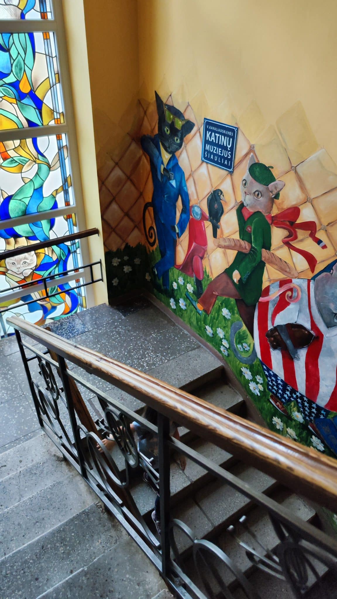 - Laiptinę taip pat puošia katinai vitražuose ir ant sienų