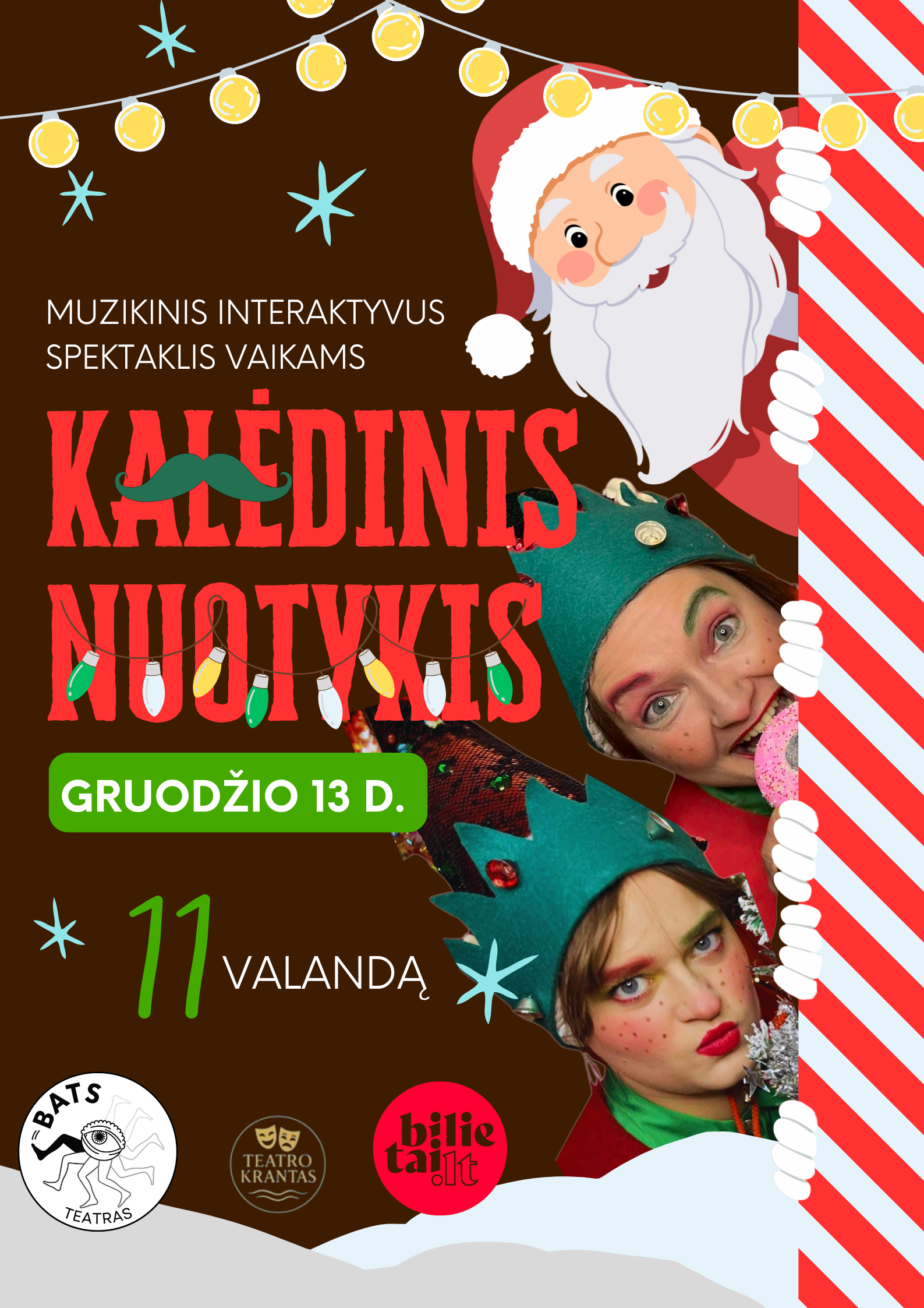 Teatras BATS pristato nuotaikingą, užburiantį, interaktyvų muzikinį spektaklį – nuotykį, kuris Jus traukte įtrauks į laukiamiausių metų švenčių atmosferą. Kalėdų Senelio elfai Bilis ir Baris, kaip ir kasmet, laukia tų magiškųjų švenčių. Tačiau atsitiko toks nesuprantamas dalykas ir visiškai sujaukė jų planus. Nejaugi Kalėdos neįvyks? Mūsų ištikimieji elfai, kartu su vaikais, ieškos atsakymų. Apie ką iš tiesų yra Kalėdos? Kas yra Kalėdinė dvasia? Ar būtinai tik žaislai ir dovanos sukuria šventę?