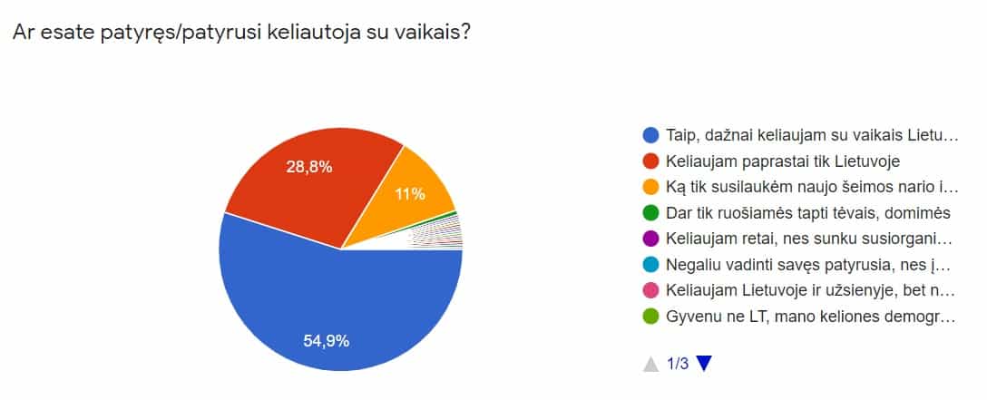 Dauguma apklaustųjų su vaikais keliauja ar aktyviai leidžia laiką Lietuvoje ir užsienyje (virš 54%). Beveik dar 30% keliauja ir pramogauja pagrinde Lietuvoje. Sekėjų patogumui, yra sukurtos teminės “Keliaujančios mamos” Facebook grupės skirtos kelionėms į užsienį ir atskirai kelionėms po Lietuvą, turinčios daugiau nei po 25 000 narių, kur galima iškart gauti patarimus iš labiau patyrusių, sužinoti neatrastų vietų ir maršrutų idėjų. Apie 10% dalyvavusių apklausoje yra nuolat gyvenantys ne Lietuvoje, kas labai praverčia dalinantis teminėse grupėse patarimais apie šalis iš nuolatinių gyventojų perspektyvos, kur jie lankosi su vaikais. Dalis tėvelių atsakingai ruošiasi kelionėms su vaikais jų besilaukiant ar tik gimus (apie 11%), todėl dalinamės ir informacija apie keliones nėštukėms bei apie ypatumus keliaujant su pačiais mažiausiais.