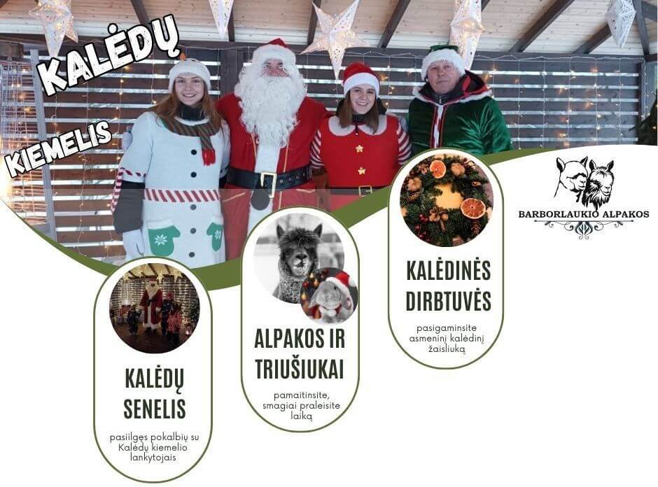 Barborlaukio dvaro parkas puošiasi įspūdingomis dekoracijomis ir pavirs Kalėdų kiemeliu. Kalėdų senelis lauks jaukioje rezidencijoje vaikučių, su kuriais smagiai žais. O šalia to atvykus bus galima paskanauti įvairių gardumynų, karštų gėrimų, išsirinkti dovanų, mielų smulkmenėlių patiems brangiausiems žmonėms. Mažieji galės parašyti laišką ir jį įmesti į Kalėdinio pašto dėžę. Vyks kūrybinės dirbtuvės. Ir tai dar ne viskas! Visų apsilankiusiųjų lauks dvaro žaviosios alpakos ir patys mieliausi triušiukai, kurie mielai pasmaguriaus skanumynų iš jūsų rankų ar papozuos jūsų unikalioms kalėdinėms nuotraukoms.