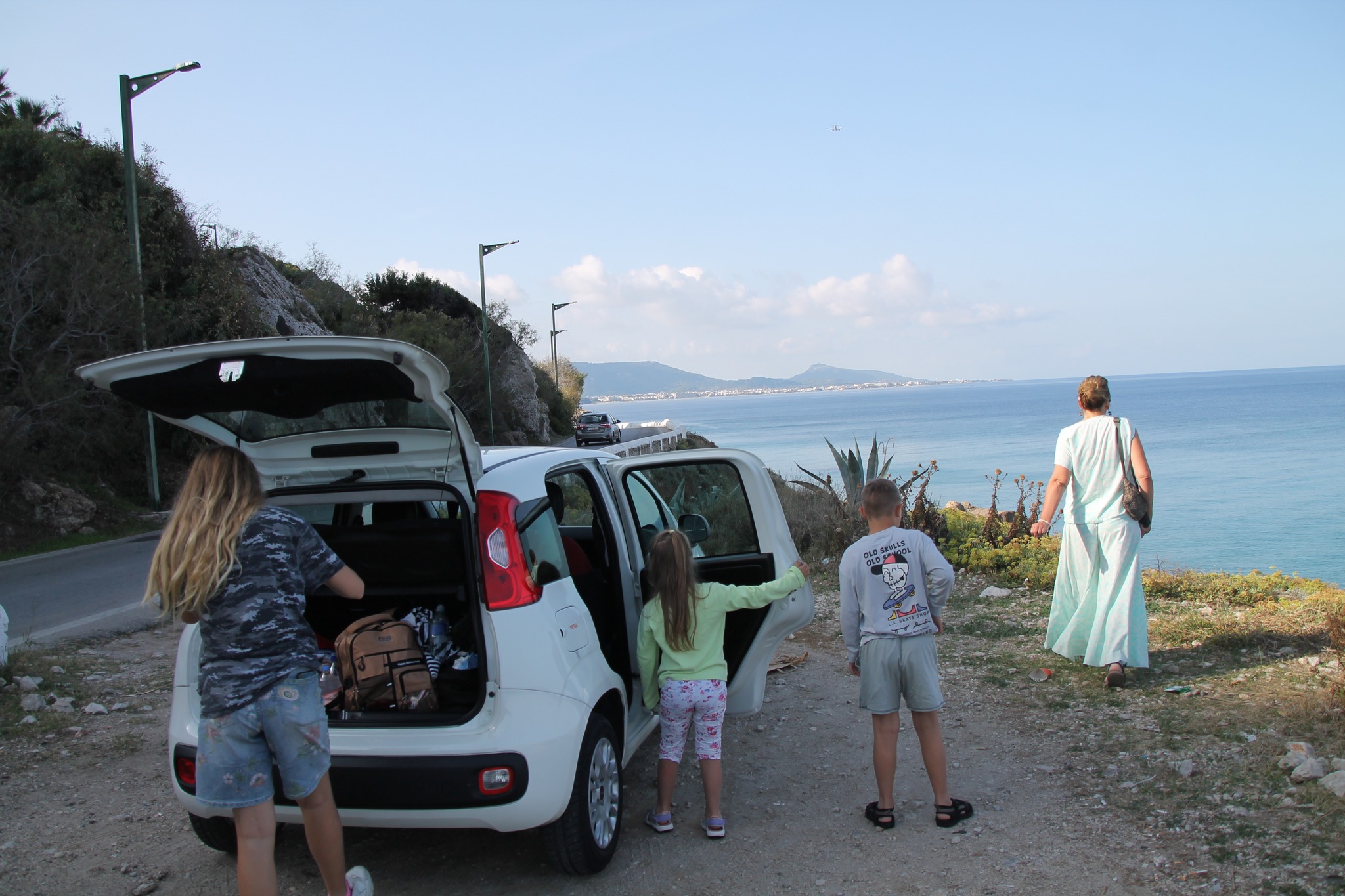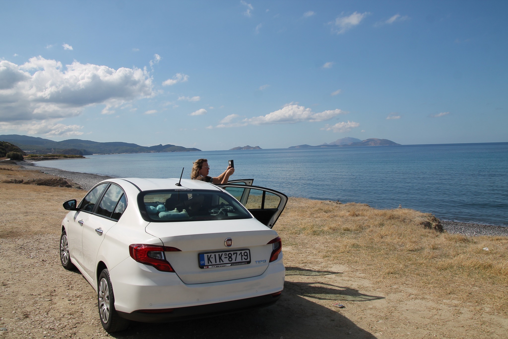 Paskutinę atostogų dieną dar kartą išsinuomavome automobilį – šįkart mažesnį, žavią FIAT Panda, kad galėtume dar kartą aplankyti kelias išskirtines vietas Rodo saloje. Vairuoti Rodo saloje nėra sunku – keliai geri. Gal kiek sunkiau miesteliuose, kai tenka įkalnėje prasilenkti dviem automobiliams. Neįgaliųjų automobiliams skirtų parkavimo vietų matėme tik prie prekybos centrų.