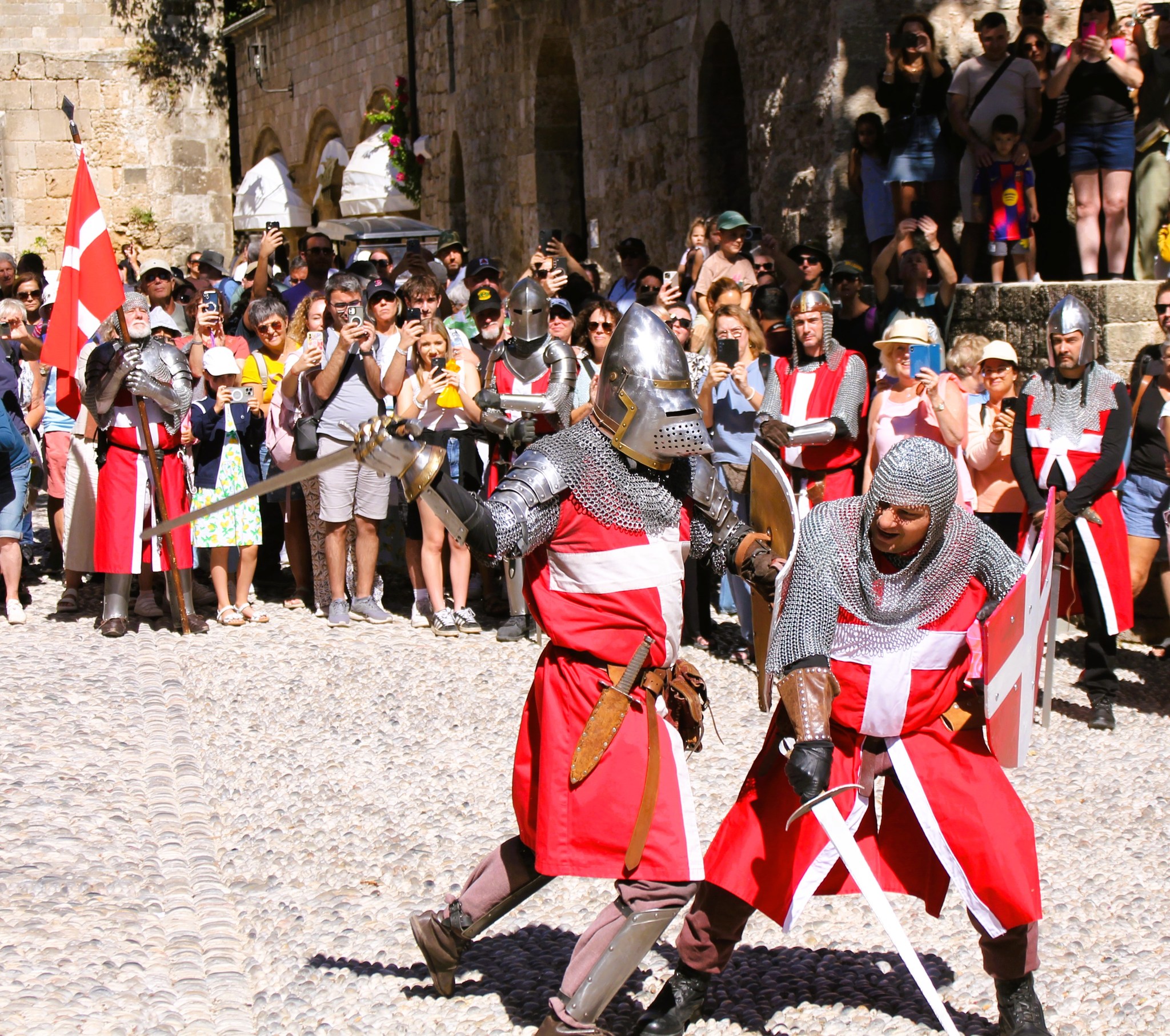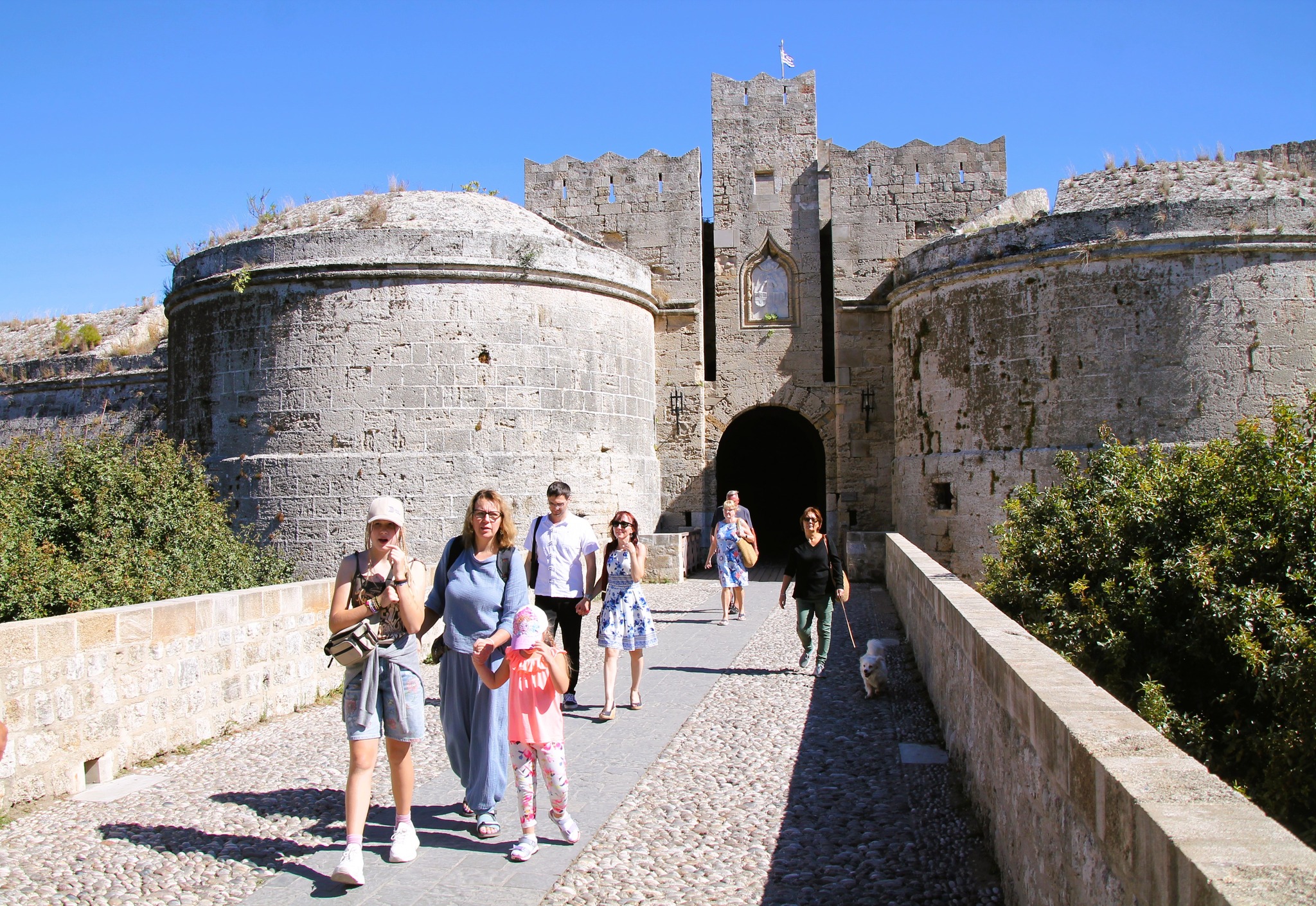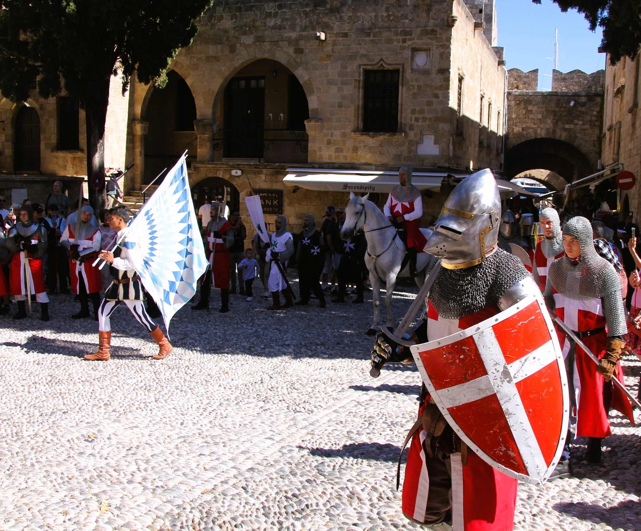 Juk vyko viduramžių Rožių festivalis prie Rodo riterių Didžiojo magistro rūmų. Taigi, nuo šalia esančios viešbučio stotelės sėdome į vietinį autobusą ir už 10 EUR nuvykome į Rodo miestą ieškoti senamiestyje esančių rūmų. Radome Didžiojo magistro rūmus Rodo senamiestyje Riterių gatvės gale. Pastatyti ant Saulės dievo Helijaus šventyklos pamatų rūmai viduramžiais tapo valdytojo rezidencija ir administraciniu centru. O ten sutikome ir riterių ir didikų ir miestelėnų, ir kovas regėjome ir šokius stebėjome.