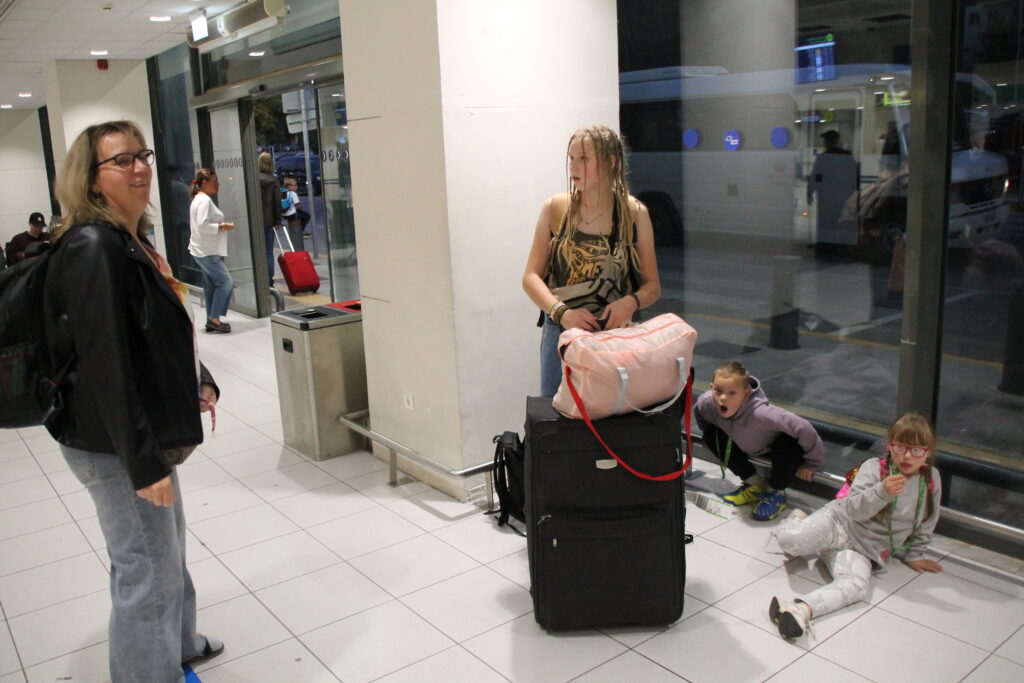 Oro uoste vaikai dėvėjo jau ankstesnėse kelionėse pasiteisinusias „saulėgrąžų“ juosteles, kurios paspartino ne tik bagažo pridavimą, bet ir įlaipinimą – tiek skrendant į Rodą, tiek grįžtant atgal.