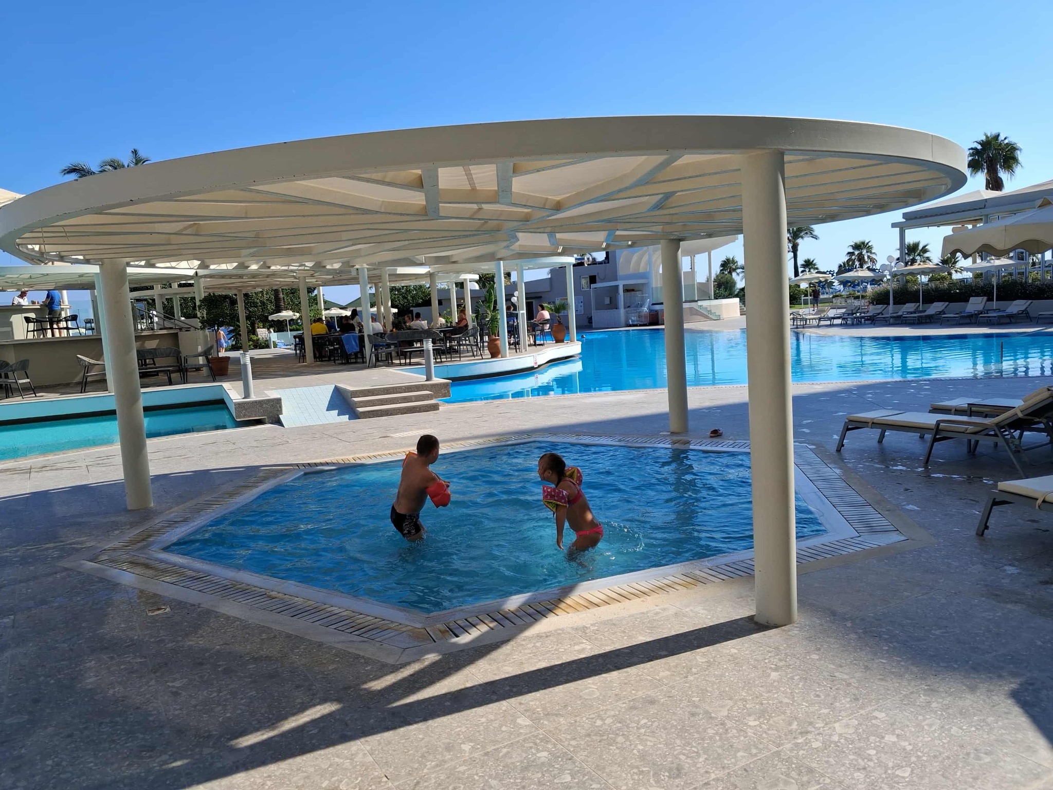 Kokie šio viešbučio privalumai? Šis viešbutis yra puikus, nes stovi tiesiai ant garsiojo „Mėlynosios vėliavos” paplūdimio (Kallithea) ir yra puiki vieta atsipalaiduoti su puikiu deriniu tarp gamtos ir komforto. Taigi, iš kambario tiesiai eini paplaukioti į jūrą. Viešbutis siūlo naudojimui išskirtinį SPA ir sveikatingumo zoną: vidaus baseinas, masažai, sporto aikštelės – idealu tiems, kurie nori ne tik gulėti paplūdimyje, bet ir atgaivinti kūną. Maistas – aukšto lygio: keli restoranai ir bufetas, kuriame yra tiek vietinės Graikijos virtuvės patiekalų, tiek tarptautinių pasirinkimų. Personalas yra labai svetingas ir pasirengęs padėti. Yra nemokamas belaidis internetas visoje viešbučio teritorijoje. Šiame viešbutyje yra vaikų zona, nedidukas vaikų baseinas (tik gaila, kad nešildomas), žaidimų aikštelė. Vaikams iki dvylikos metų vyksta įvairios veiklos, kurias veda nuostabi animatorė. Pirmą dieną ji labai atsargiai žiūrėjo į mūsų vaikus, prašė pasilikti didžiąją sesę, bet vėliau mažieji likdavo vieni su ja ir šauniai sutarė. Tai leido mums šiek tiek atsipūsti. Kol vaikai linksminasi, mes pasimėgavome viduje esančia vandens pramogų erdve skirta suaugusiems.