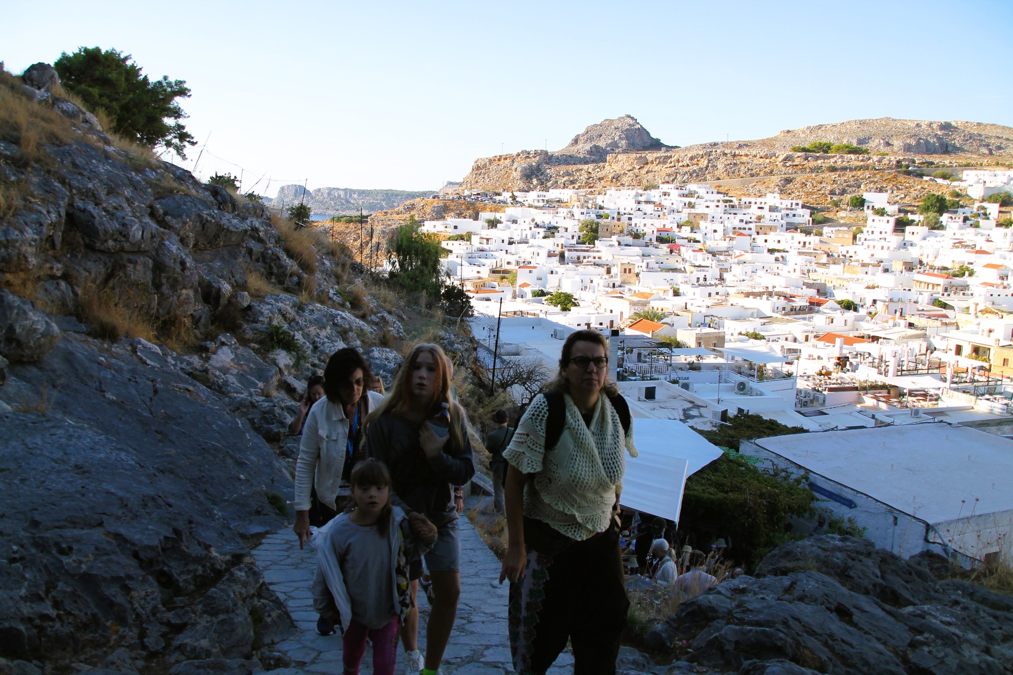Pasistatę automobilį aištelėje ir sumokėję 7 EUR už stovėjimą, gatve patraukėme link Lindos akropolio. Priėję kasas už visus 5 šeimos narius sumokėjome 10 EUR ir su kitais turistais patraukėme laiptais aukšyn.