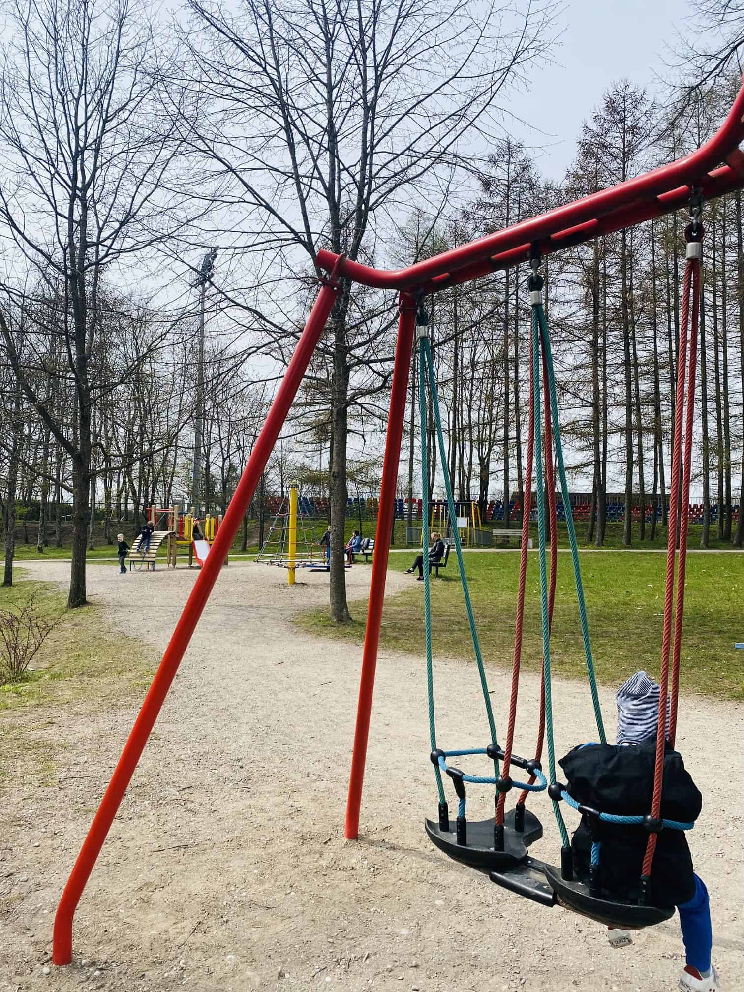 Prie vaikų aikštelės wc, aikštelėje ne tik daug supynių bei laipynių mažiesiems, bet ir vystymo lenta, nei vienam parke dar tokio dalyko nemačiau. Šiuo metu visi krantai žydi narcizais, ypatingas metas!