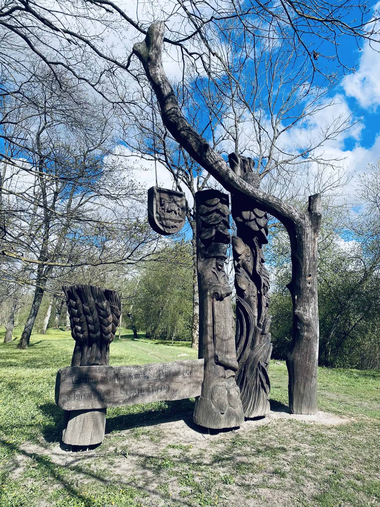 Daug medinių skulptūrų, naujoviškų ir šiuolaikinių iš metalo. Sutikom žirgų, šalia parko yra Priekulės žirgynas, tai tuo metu, matyt, vyko treniruotė. Retai taip kur pamatysi.