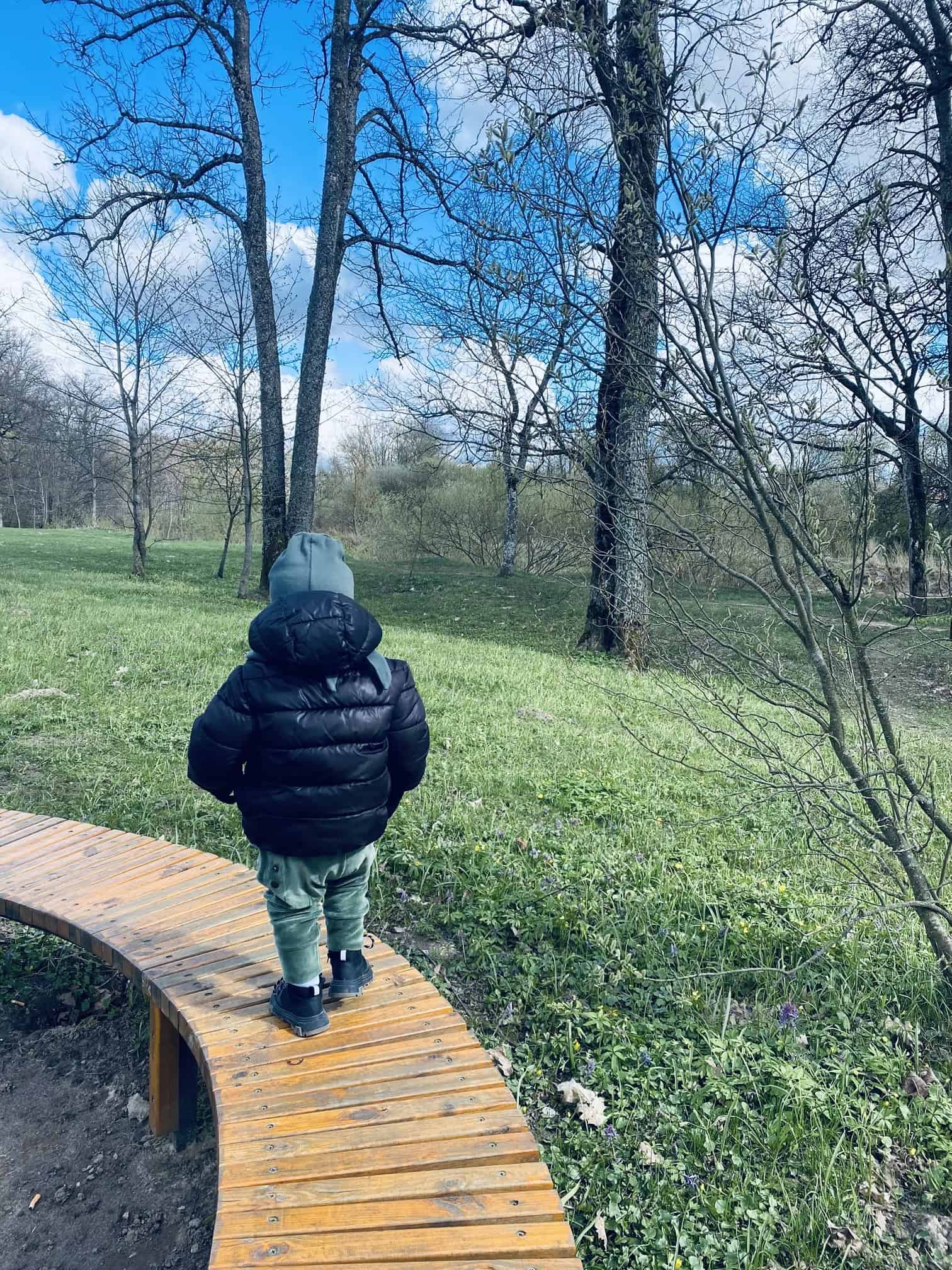 Su vežimu drąsiai pravažiuosi, o ir pats vaikas gali praeiti, tikrai kojytės neįkris, nėra didelių tarpelių, vaikai nebijos. Mūsiškis buvo tik užmigęs, liko mašinoje, tad tilto nepamatė, teks kitą kartą atvažiuoti.