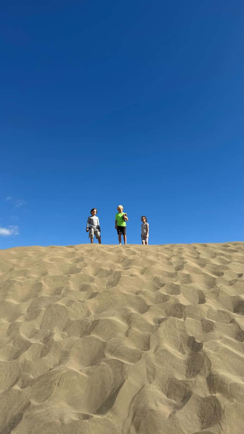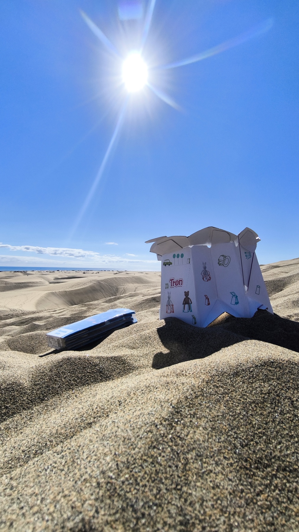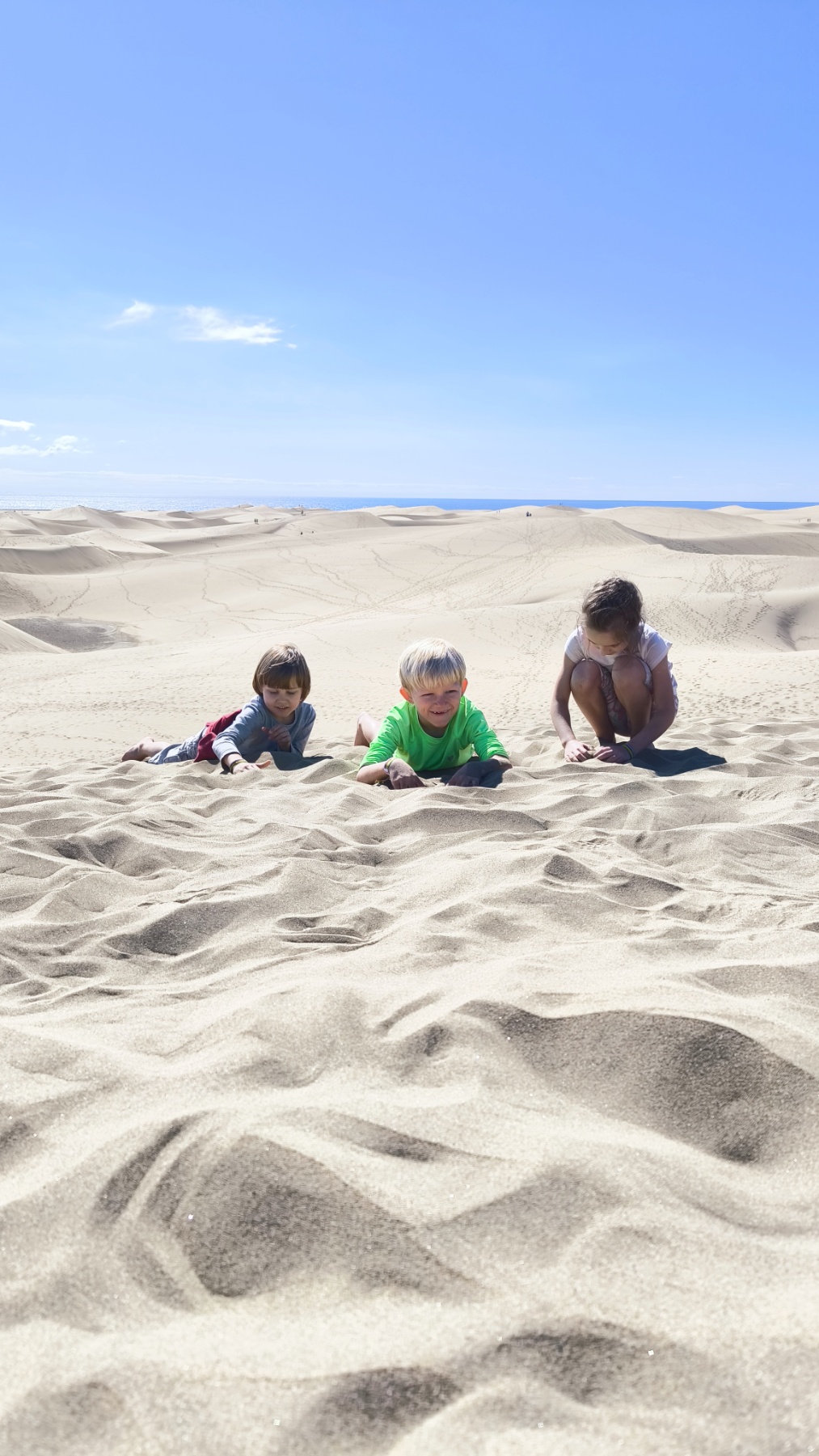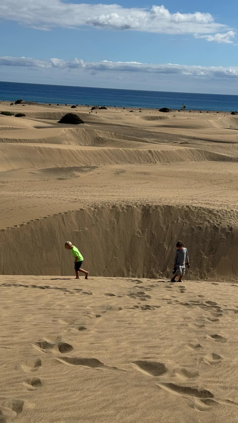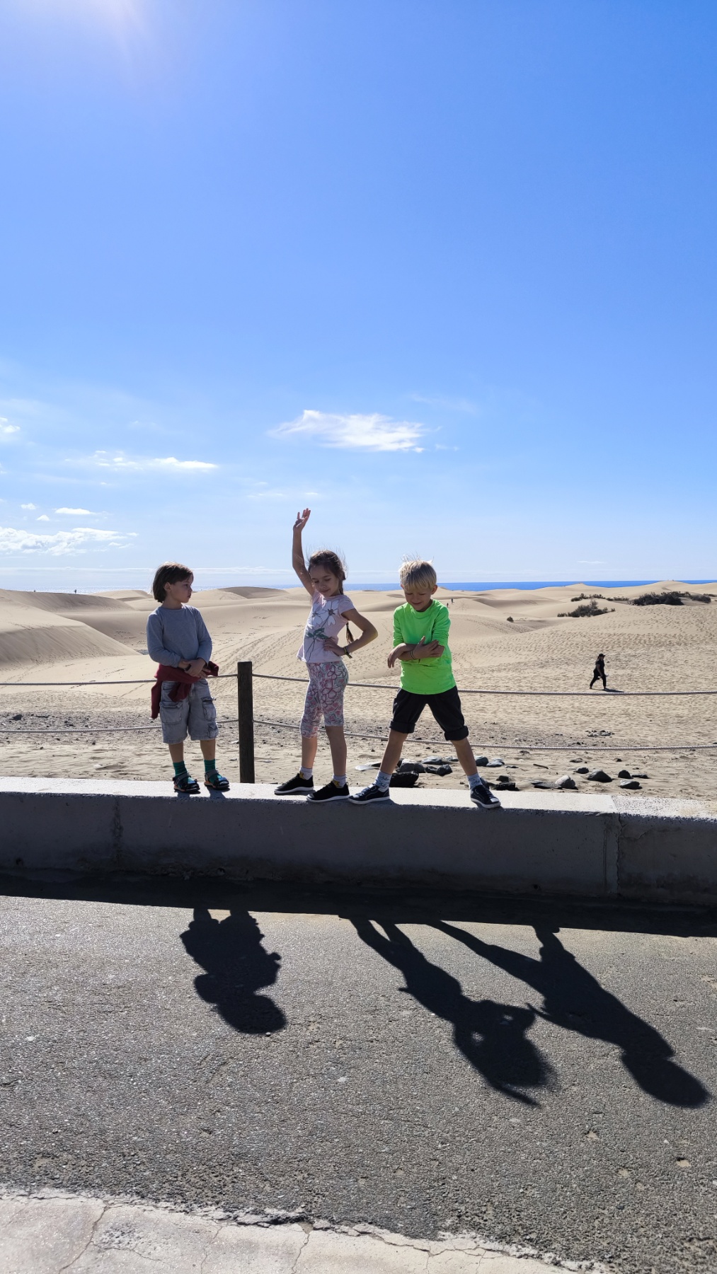 O Gran Kanarijoje prasidėjo tikrieji mūsų nuotykiai. Iš anksto (kaip visiems ir rekomenduojame) buvome sutarę su tautiečiu gidu ekskursiją po salą. Iš vakaro susirašę ir maloniai sutarę susitikti ryte prie laivo ekskursijai, ryte sulakiame žinutės – gidas rimtai susirgo, temperatūra, o mes su vaikais. Tai palinkėję sveikatos nusprendėme viešu transportu pavažiuoti į didžiausią įspūdį prieš porą metų vykusios mamų kelionės metu palikusią salos vietą – Maspalomas kopas. Ir tai nėra sudėtinga, valandėlė autobusu iš stoties, kuri yra visai šalia vietos kur stoja kruiziniai laivai – ir tu jau atsiduri kopų dykumoje. Vaikams labai patiko ir šįkart. Svarbiausia pasirūpinkite tokiai išvykai būtiniausiais daiktais – pilnom gertuvėm vandens,  tinkamų servetėlių maistui ir rankoms , užkandžių. Ir vienkartinių Troniukų, nes tualetą vargiai  rasite šalia, kopos užima 404 hektarų ir yra saugoma kaip gamtos rezervatas nuo 1987 m.