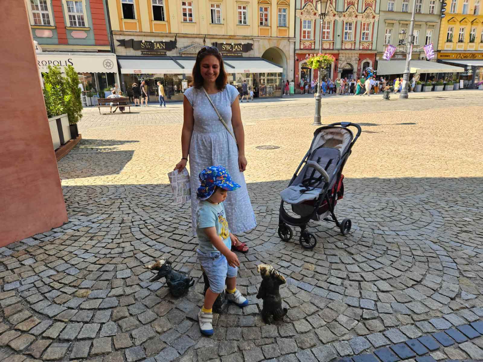 Wroclavas. Tiesą sakant, kadangi žinojom, kad turim labai ribotą laiką, tai tiesiai iš dinozaurų parko važiavom ne į apartamentus nakčiai (kuriuos pasiėmėme miegamajam rajone), bet iškart į centrą prie šviečiančio grojančio fontano (Wrocław Multimedia Fountain) į paskutinį to vakaro pasirodymą. Vėliau – į naktinį senamiestį. Mažiausias dalyvis „lūžo“ vežimėlyje, tai turėjom progą ramiai sukirsti po naktinį kebabą ir „apsiuostinėti“ kas kaip. Ryte susikrovę daiktus į automobilį ir apleidę savo apartamentus sėdom į tramvajų paskutinei atostogų pažintinei dienai. Rytą paskyrėm pamaklinėjimui po dieninį senamiestį. Neatsispyrėm ir mes suvenyrinėje nusipirkti nykštukų žemėlapį su lipdukais. Nors mūsų todleriui to žemėlapio lipdukų klijavimo prasmė dar nelabai aiški, bet patiems su vyru buvo smagu bent trumpam pabūti „kolekcionuojančiais vaikais“. (Tiesa, žemėlapiai pardavinėjami skirtingomis kainomis, su skirtingu kiekiu surenkamų nykštukų, tai pirkdami atkreipkit į tai dėmesį!).