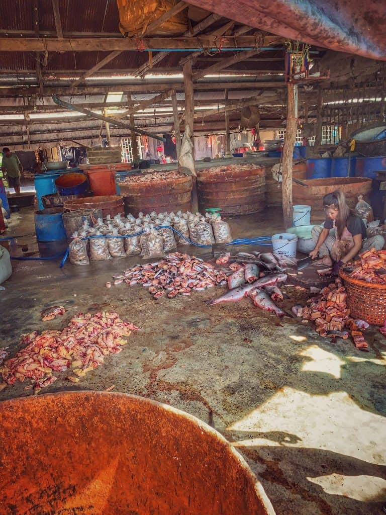 Sunkiau buvo ištverti sustojimą žuvies turguje. Tiek dėl kvapų, tiek ir vaizdai neeiliniai. Kadangi miestas įsikūręs ant upės tai žuvininkystės tradicijos ten irgi eina iš kartos į kartą. Ten nepamatysime nei šaldytuvų nei ledo kažkokių gabalų, viskas išdarinėjama prie 30 – 34 laipsnių karščio, kai kas sūdoma, kai kas malama ir kažkaip bačkose rauginama. Sunku buvo ištverti tą dvoką, bet tuo pačiu ten dirbančios moterys man pasirodė kaip didvyrės (nors tikriausiai jos to kvapo jau nebejaučia, nes ne tik ten dirba, bet ir gyvena už plonos sienos suręstose lūšnelėse).