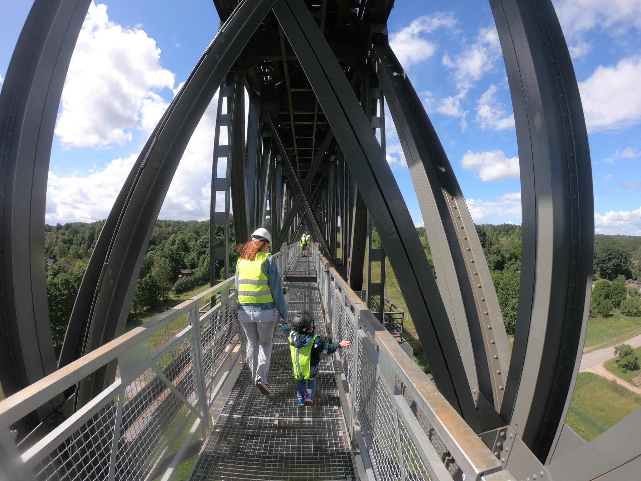 Ekskursantai gali ant tilto patekti tik su gidu iš Dubysos regioninio parko. Jei esate pavienė grupė, tai bilietus galima įsigyti internetu, o jei norėtųsi kažko privataus (nuo 15 asmenų), tai reikėtų susisiekti su parko direkcija. Taigi, šiek tiek istorijos ir mes einame lankytojams skirtu taku – 33 metrų aukštyje. Joakimas – traukinių fanatikas, tad net neužlipus jau pradeda klausinėti, o kur traukinys. Dešimt minučių mūsų kelionės tiltu ir „aleliuja“, virš galvos pralekia traukinys. Jausmas? Tiesiog garsu, juda šiek tiek nuo vibracijos pati konstrukcija, bet nieko siaubingo. Eidami klausomės istorijos, grožimės Dubysos vingiais, Lyduvėnų miesteliu. Įdomus faktas, kad kažkada gyveno beveik pusė tūkstančio gyventojų, o dabar miestelį savo namais vadina vos vietinių. Nors tą dieną buvo pranašautas lietus ir jį sutikome pakeliui, bet ant tilto mus pasitiko geras oras, saulutė ir šiek tiek vėjo – man tiesiog tobulybė.