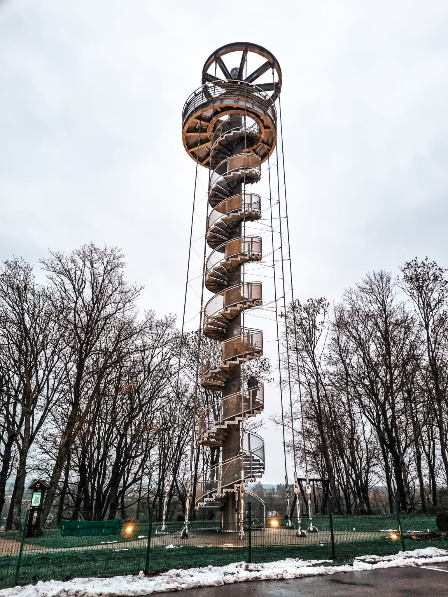 - Šiaulės kalno apžvalgos bokštas – Mums pasirodė įdomiausias, kadangi turi du užlipimus arba vieną užlipimą kitą nusileidimą, todėl vaikui tai buvo ypač smagu. Vaizdas į Tytuvėnų regioninį parką.