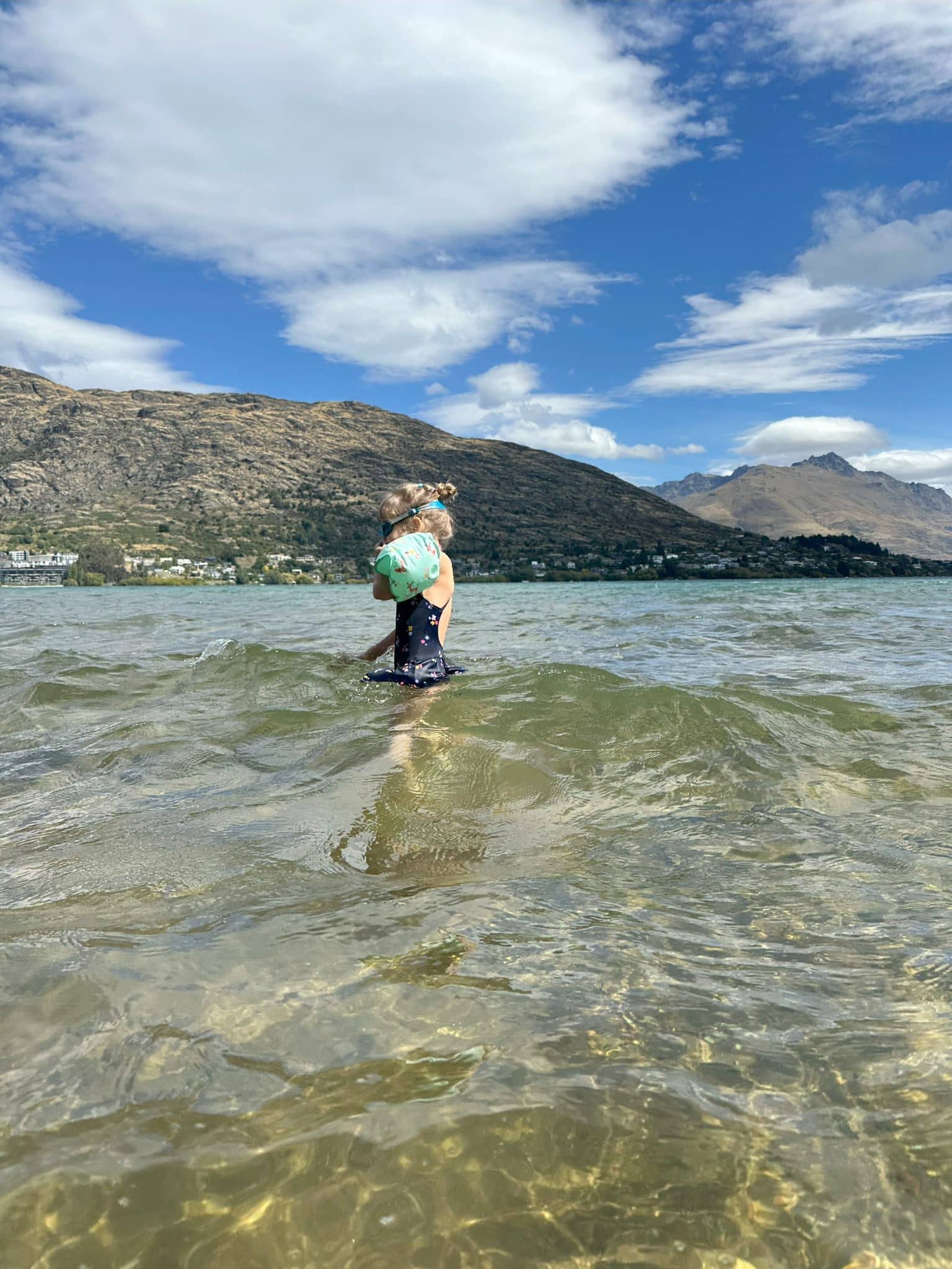 3 d. Skrydis į pietinę salą Queenstown. Pasiimam nuomotą mašiną ir vykstame į kempingą apsistoti. Kempingas puikus, namelis su kvapą gniaužiančiu vaizdu į ežerą ir kalnus. Smagi vaikams žaidimų aikštelė. Tinkama pakrantė maudynėms.