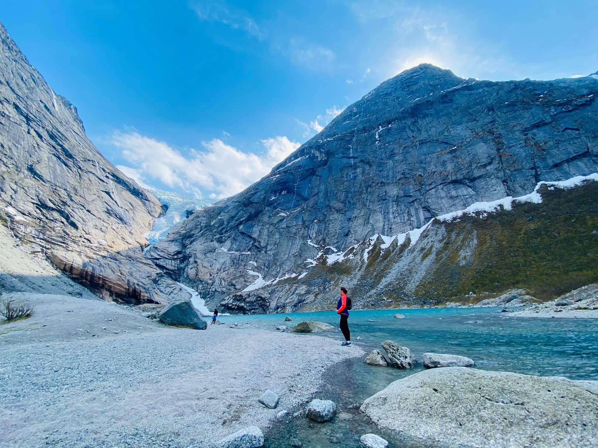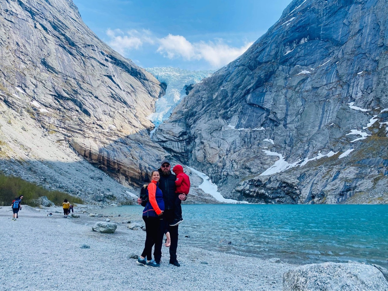 Henrika: ,,Kas gyvena Norvegijoje jau žino, jog vasaros sezonas čia tikrai labai trumpas. Ir ką gi veikti, kai esi 30 sav. nėščia? Bet ka! Nėra ko laukti: planuoji ir šoki į kelionę! Kelionė mums truko apie 8 val. mašina+keltuku. Sekančią dieną susiplanavome žygį prie ledyno, kuris buvo gan nesudėtingas ir tikrai įveikiamas (pirmyn atgal apie 6 km.). Ledynas: Briksdalsbreen. Patikrinusi savo galimybes, užsidėjau kompresines kojines ir leidomės prie sekančio ledyno, stačiu stačiu kalnu aukštyn bei akmenuota kalnų upe. Ledynas: Brenndalsbreen. Nors man jo pasiekti ir paliesti jau nepavyko. Bet pats žygis buvo vertas ir to vaizdo.