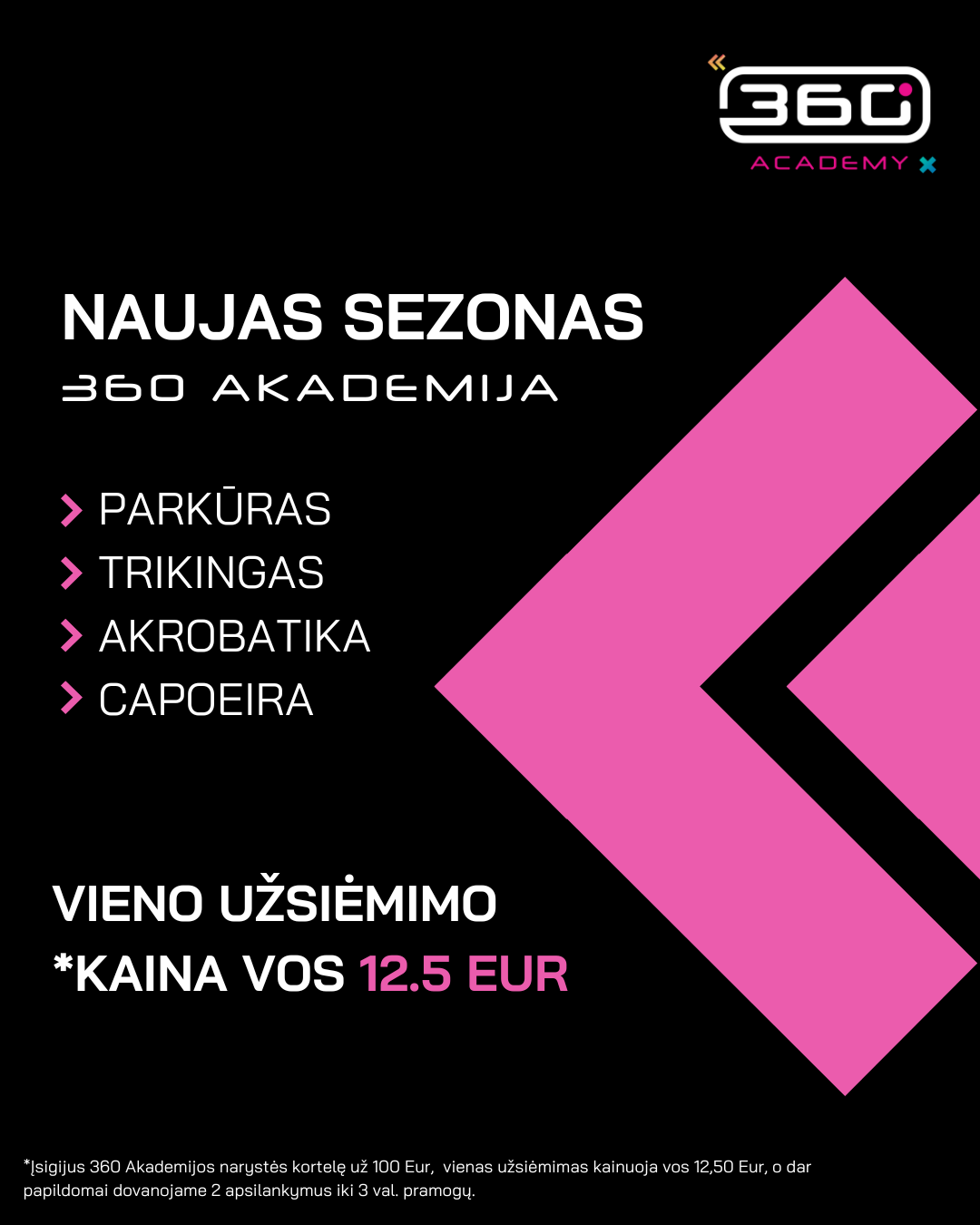 Registracija vyksta iki rugsėjo mėnesio. Nori išbandyti ar patiks? Laukiame rugsėjo 18-19 dienomis 16:00-18:00 ATVIRŲ DURŲ DIENOSE (nemokamai). Startas – spalį! Kviečiame prisijungti prie 360 Akademijos ir atrasti, ką gali tavo kūnas! Daugiau informacijos oficialioje svetainėje: 360arena.lt bei Facebook ir Instagram paskyrose.