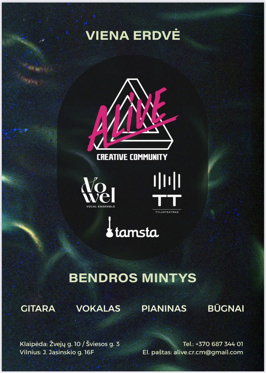 Alive CC muzikos mokykla ir multikultūrinė kūrybinė bendruomenė jau penkerius metus sėkmingai puoselėja kūrybos, saviraiškos ir savito meno atmosferą Klaipėdoje ir Vilniuje.