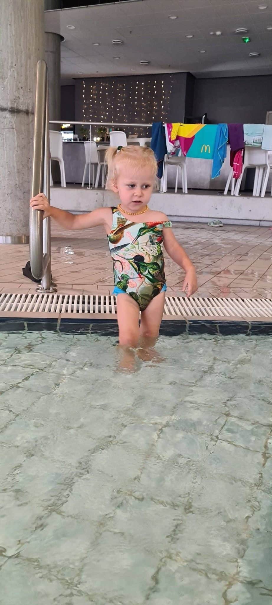 Kiekviena mama vykdama į baseiną šiek tiek nerimauja, kad vaikai neperšaltų. Maloniai nustebome, nes „Žalgirio“ arenos baseine vidaus temperatūra siekė net 31 laipsnį, o vaikų erdvėje vandens temperatūra buvo taip pat aukšta. Todėl mažyliai tikrai neperšals nei plaukiodami baseine, nei vaikščiodami po teritoriją.