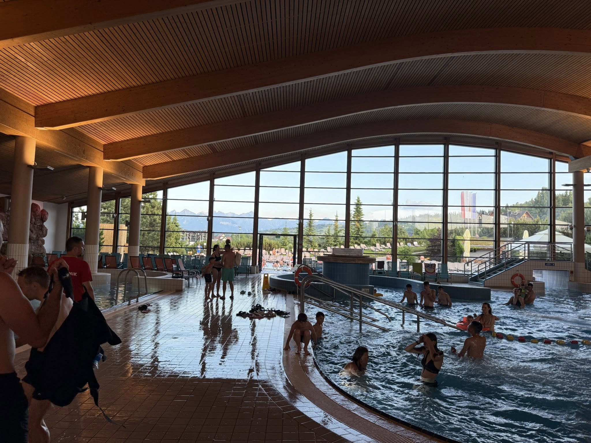 Važiavome į Termy Bania Białka Tatrzańska – labai rekomenduoju! Vanduo šiltas, daug pramogų, kavinė viduje ir food truck lauke. Nesu buvus baseine kur būtų toks šiltas vanduo, vaikai iš baseino buvo išlipę tik pavalgyt. Jei šilta lauke, pripučia batutus ir padaro čiuožyklas. Visos dienos bilietas šeimai – 105 €. Praleidome ten visą dieną.