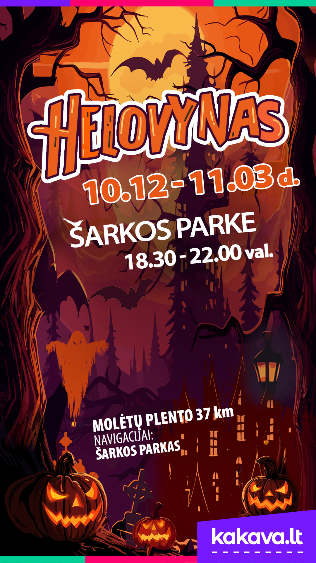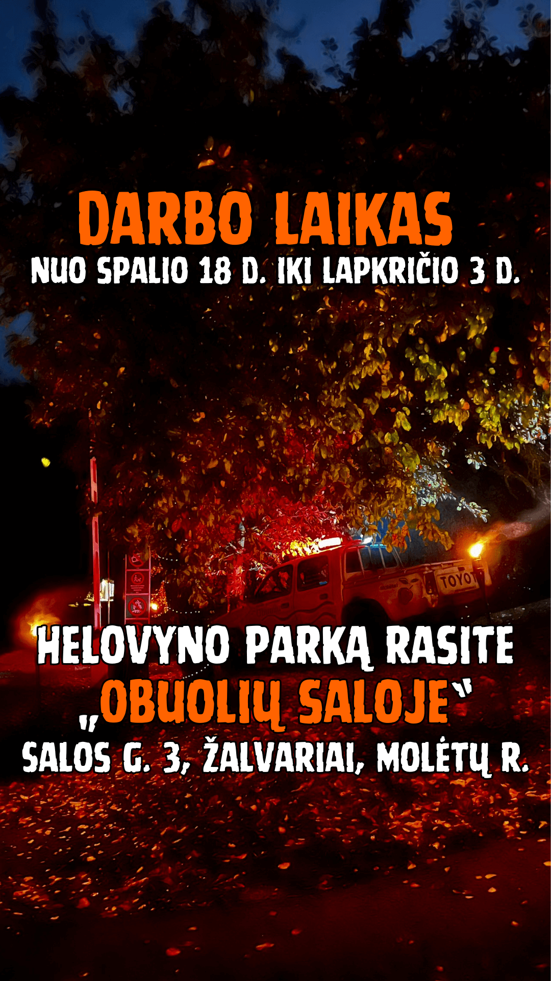Parkas dirba nuo spalio 18 d. iki lapkričio 3 d. Darbo laikas: 10-22 val. Animatoriai šiurpina: Penktadieniais, šeštadieniais ir spalio 28-31 d. nuo 18 iki 22 val. Pasivaikščiojimai be gąsdinimų ir animatorių kiekvieną dieną nuo 10 iki 18 val. (šiems bilietams taikoma -50% nuolaida). Helovyno parką rasite „Obuolių saloje“, Salos g. 3, Žalvariai, Molėtų r.