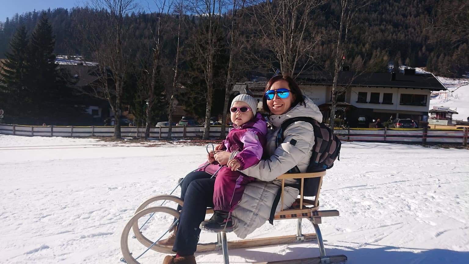 Įspūdžiais iš Austrijos Lachtal kurorto @keliaujancios_mamos instagrame dalinosi mama Gintarė . Gintarė juokiasi: „Vaikai to nėra bandę, bet sakom – ne bėda, išmoks. Arba gaus čiuožti rogutėmis.”