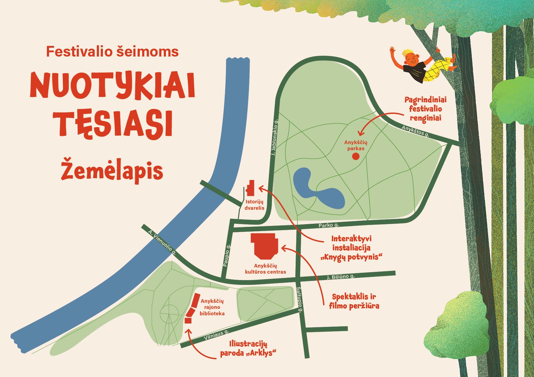 Festivalis vaikams po atviru dangumi „Nuotykiai tęsiasi“ 2024 metais vyks jau šeštą kartą. Keliamės į Anykščių miesto centrą! Renginiai vyks Anykščių miesto parke, bibliotekoje, Istorijų dvarelyje ir miesto kultūros centre. Visos šios vietos yra 2 minučių atstumu viena nuo kitos, todėl be jokio vargo galėsite dalyvauti jose vyksiančiuose renginiuose.