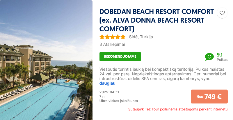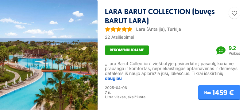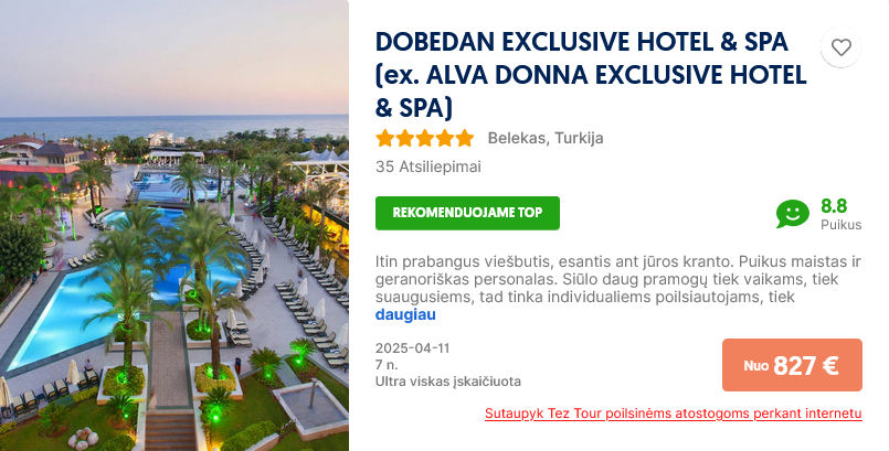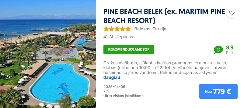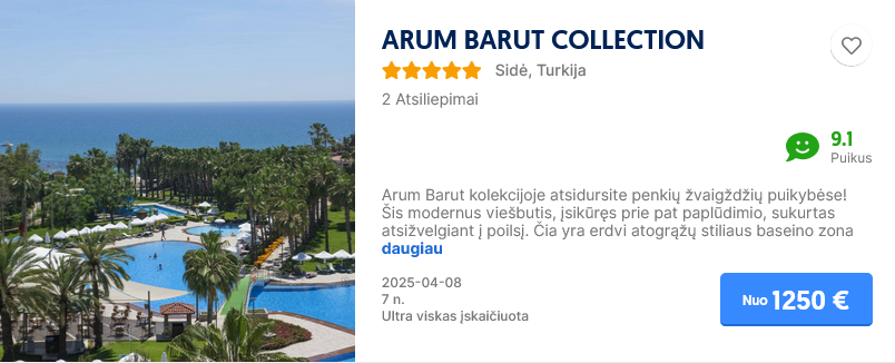 Savaitė poilsio su ultra viskas įskaičiuota šiame viešbutyje, priklauso nuo datos bei nuolat kinta, pasitikrinti kainą savo pageidaujamu laikotarpiu.