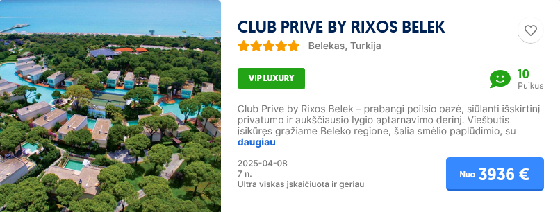 Savaitė poilsio su ultra viskas įskaičiuota šiame viešbutyje, priklauso nuo datos bei nuolat kinta, tad pasitikrinti kainą savo pageidaujamu laikotarpiu.