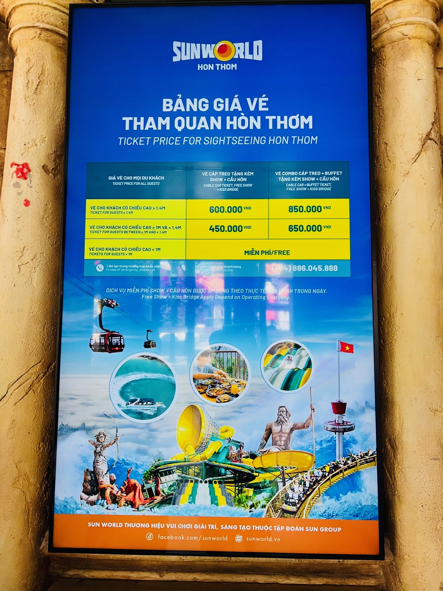 - SUN WORLD HON THOM – Saulės Pasaulis – tai Vietnamo teminių parkų tinklas, kuris skirtinguose regionuose sukuria kažką tikrai įspūdingo. Phu Quoc jie pastatė ilgiausią lynu kelią, kurio ilgis yra šiek tiek mažiau nei 8 kilometrai ir tęsiasi per kelias salas. Kelionė šiuo lynų keliu trunka apie 25 minutes (kelto kaina į abi puses suaugusiam 600000 VND, vaikams iki 140 cm ūgio – 450000 VND. Į bilieto kainą įeina vakaro šou ir nemokamai galima nusifotografuoti ant KISS BRIDGE (Bučinio Tiltas), kur šiaip kainuotų ekstra 350000 VND. Pačiame Saulės pasaulyje (SUN WORLD) yra nuostabus vandens parkas ir keletas atrakcionų.